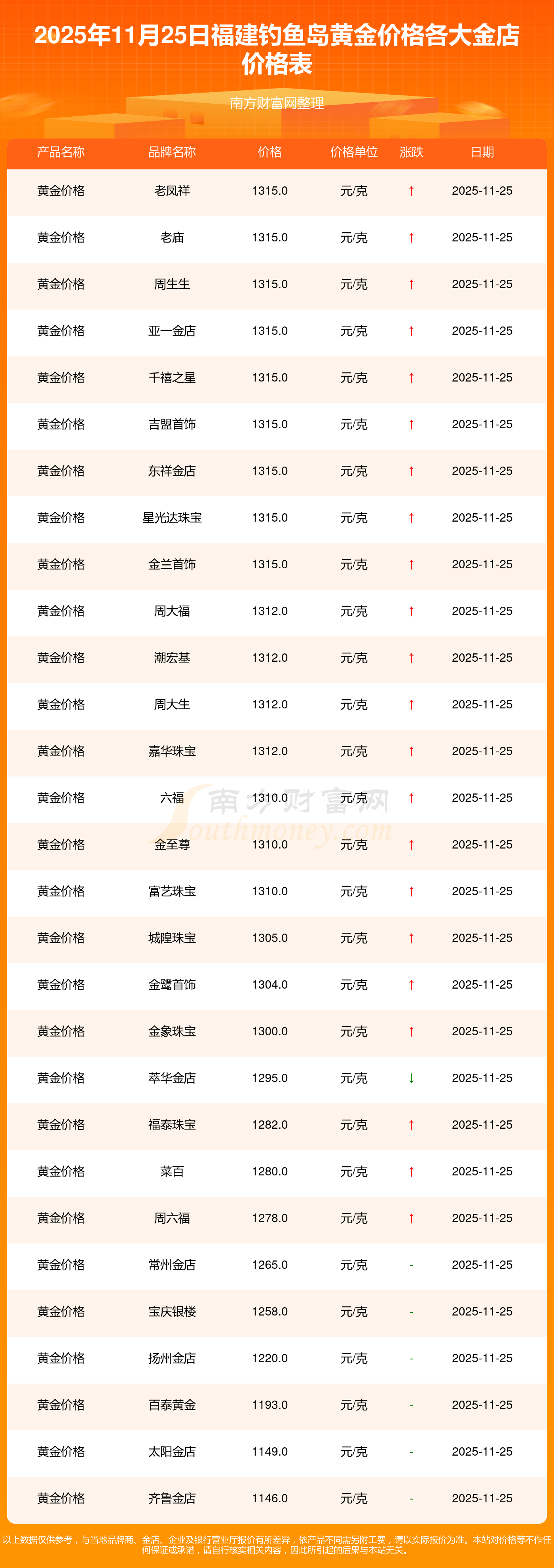 2025年11月25日,福建釣魚島周大福、周大福、周大福、周大福、周大福、周大福、周大福、老鳳祥、老鳳祥、老鳳祥、周六福等各大金店品牌黃金價格今日價格如下:周大福1312.0元/克、周大福627.0元/克、周大福1312.0元/克、周大福45780.0、周大福17900.0、周大福41290.0、周大福1148.0元/克、老鳳祥1315.0元/克、老鳳祥600.0元/克、老鳳祥1315.0元/克、周六福1278.0元/克。