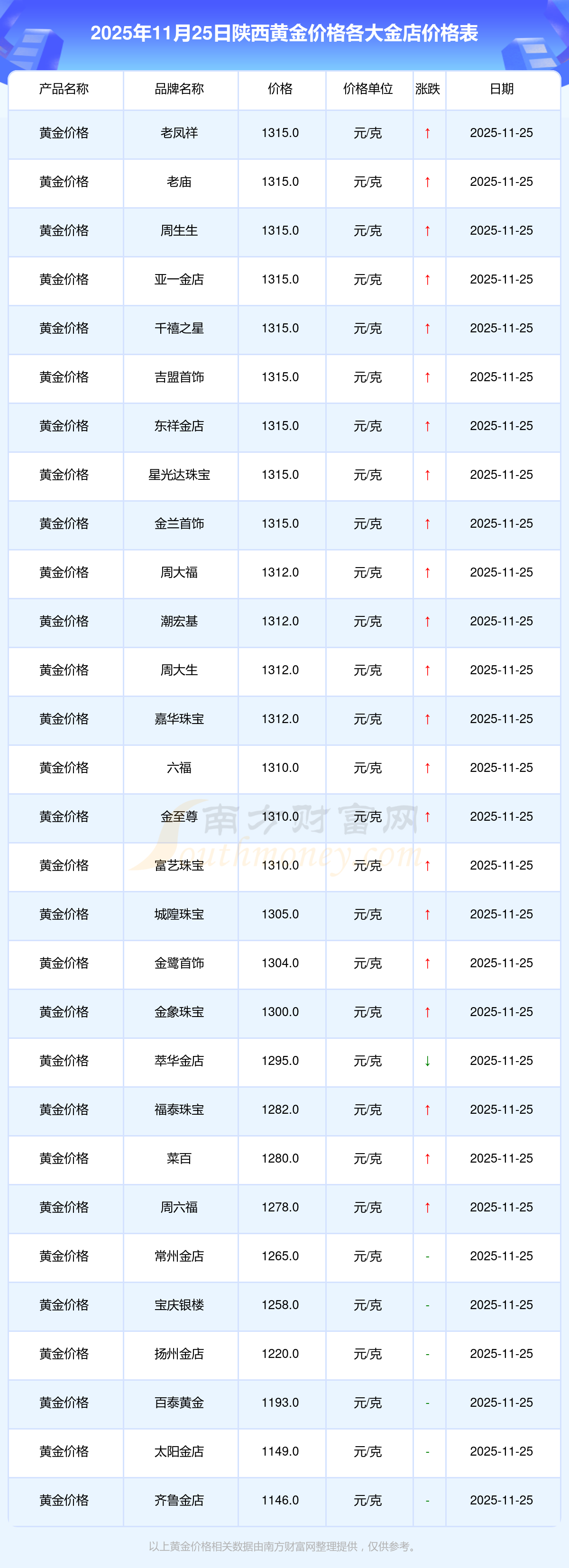 2025年11月25日陜西周大福、周大福、周大福、周大福、周大福、周大福、周大福、老鳳祥、老鳳祥、老鳳祥、周六福等各大金店品牌黃金價格最新價格如下:周大福黃金價格1312.0元/克,周大福鉑金價格627.0元/克,周大福飾品金價(內(nèi)地)1312.0元/克,周大福黃金飾品(香港)45780.0,周大福鉑金價格(香港)17900.0,周大福金條價格(香港)41290.0,周大福金條金價(內(nèi)地)1148.0元/克,老鳳祥黃金價格1315.0元/克,老鳳祥鉑金價格600.0元/克,老鳳祥足金價格1315.0元/克,周六福黃金價格1278.0元/克。
