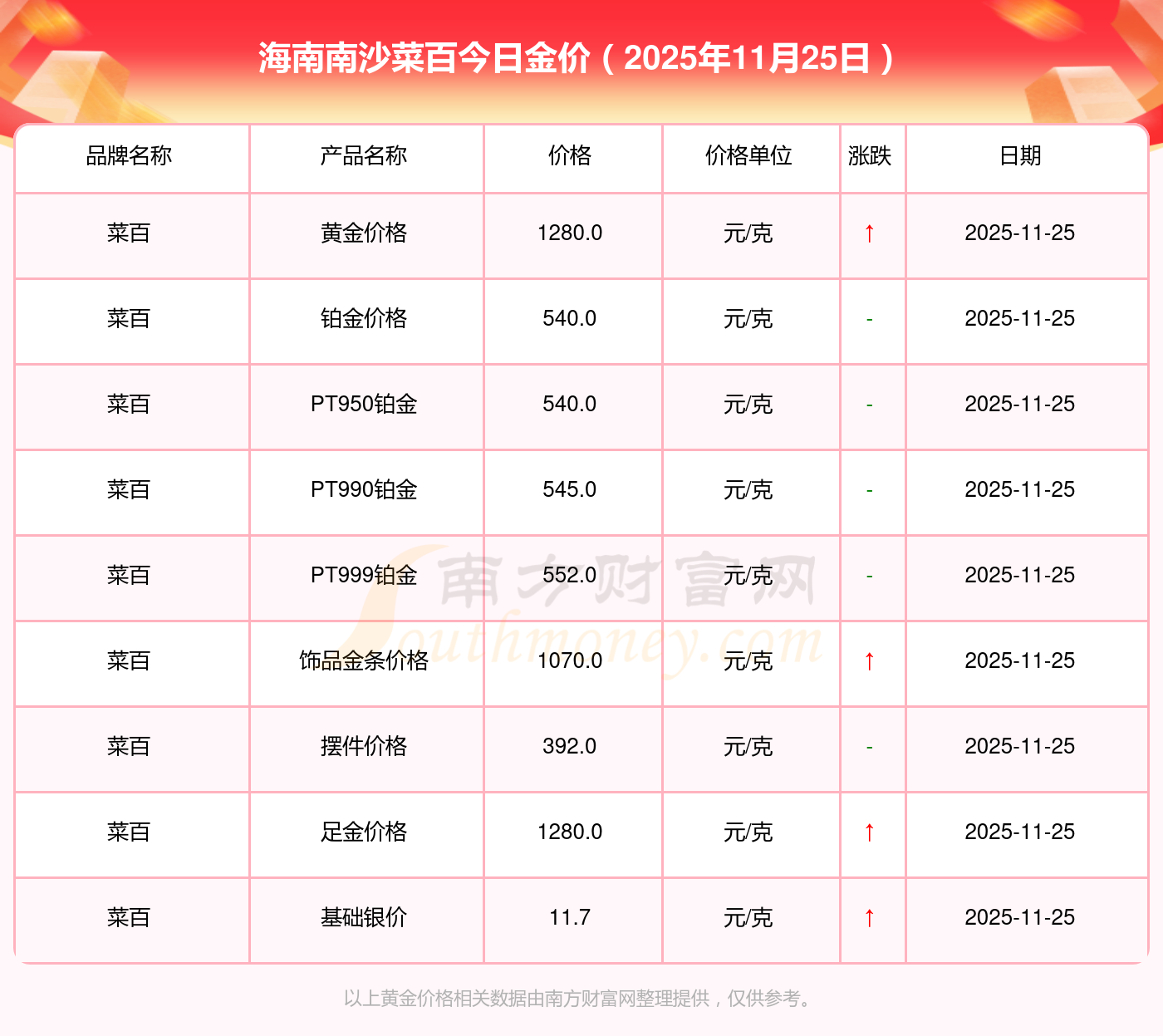 海南南沙菜百黃金價格表最新2025年,現(xiàn)在海南南沙菜百黃金價格是多少錢1克?