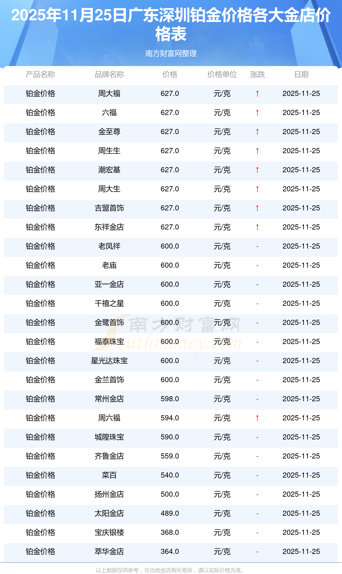 2025年11月25日廣東深圳周大福、周大福、周大福、周大福、周大福、周大福、周大福、老鳳祥、老鳳祥、老鳳祥、周六福等各大金店品牌鉑金價(jià)格最新價(jià)格行情來了,如下:周大福黃金價(jià)格1312.0元/克,周大福鉑金價(jià)格627.0元/克,周大福飾品金價(jià)(內(nèi)地)1312.0元/克,周大福黃金飾品(香港)45780.0,周大福鉑金價(jià)格(香港)17900.0,周大福金條價(jià)格(香港)41290.0,周大福金條金價(jià)(內(nèi)地)1148.0元/克,老鳳祥黃金價(jià)格1315.0元/克,老鳳祥鉑金價(jià)格600.0元/克,老鳳祥足金價(jià)格1315.0元/克,周六福黃金價(jià)格1278.0元/克。