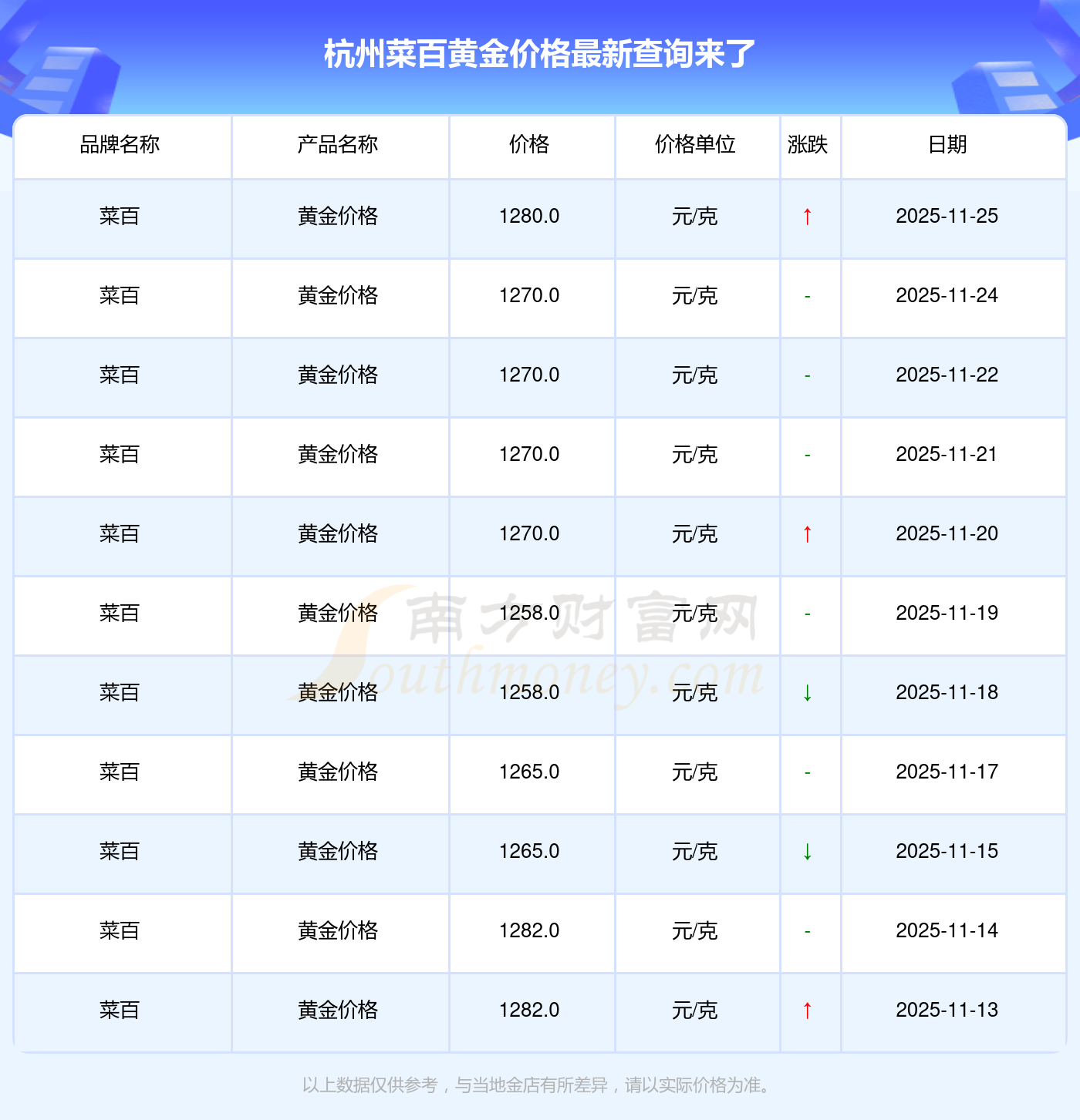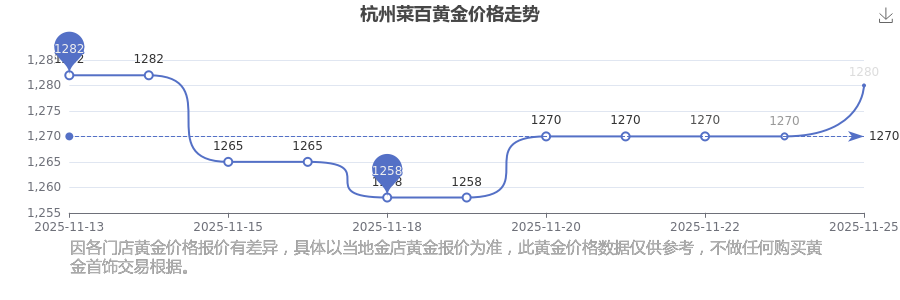 2025年11月25日杭州菜百黃金價(jià)格是1280.0元/克。