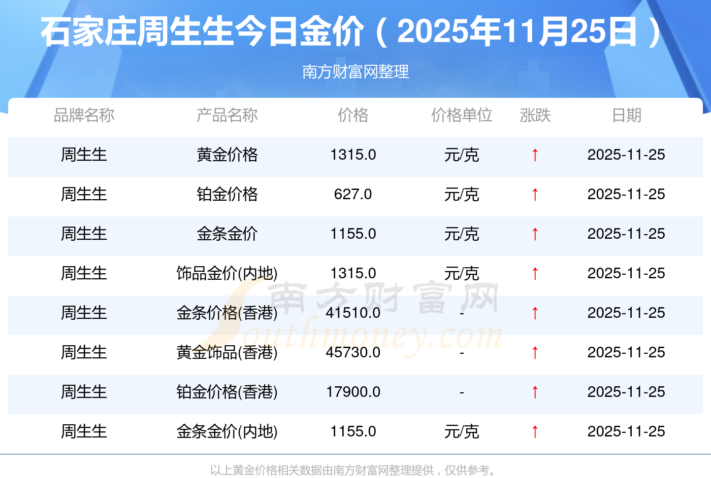 2025年11月25日石家莊周生生黃金一克的市場行情價是多少?黃金價格1312.0元/克,鉑金價格627.0元/克,飾品金價(內(nèi)地)1312.0元/克,黃金飾品(香港)45780.0,鉑金價格(香港)17900.0,金條價格(香港)41290.0,金條金價(內(nèi)地)1148.0元/克,黃金價格1315.0元/克,鉑金價格600.0元/克,足金價格1315.0元/克,黃金價格1278.0元/克。