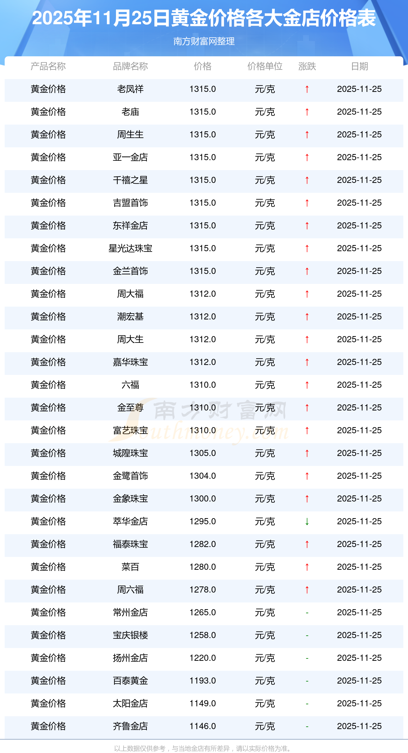 2025年11月25日,周大福、周大福、周大福、周大福、周大福、周大福、周大福、老鳳祥、老鳳祥、老鳳祥、周六福等各大金店品牌黃金價格今日價格如下:周大福1312.0元/克、周大福627.0元/克、周大福1312.0元/克、周大福45780.0、周大福17900.0、周大福41290.0、周大福1148.0元/克、老鳳祥1315.0元/克、老鳳祥600.0元/克、老鳳祥1315.0元/克、周六福1278.0元/克。