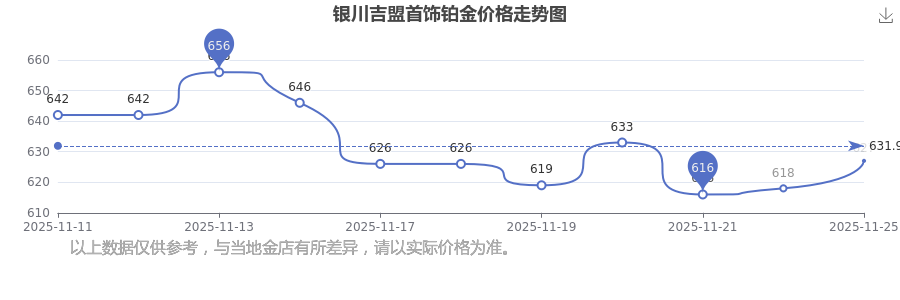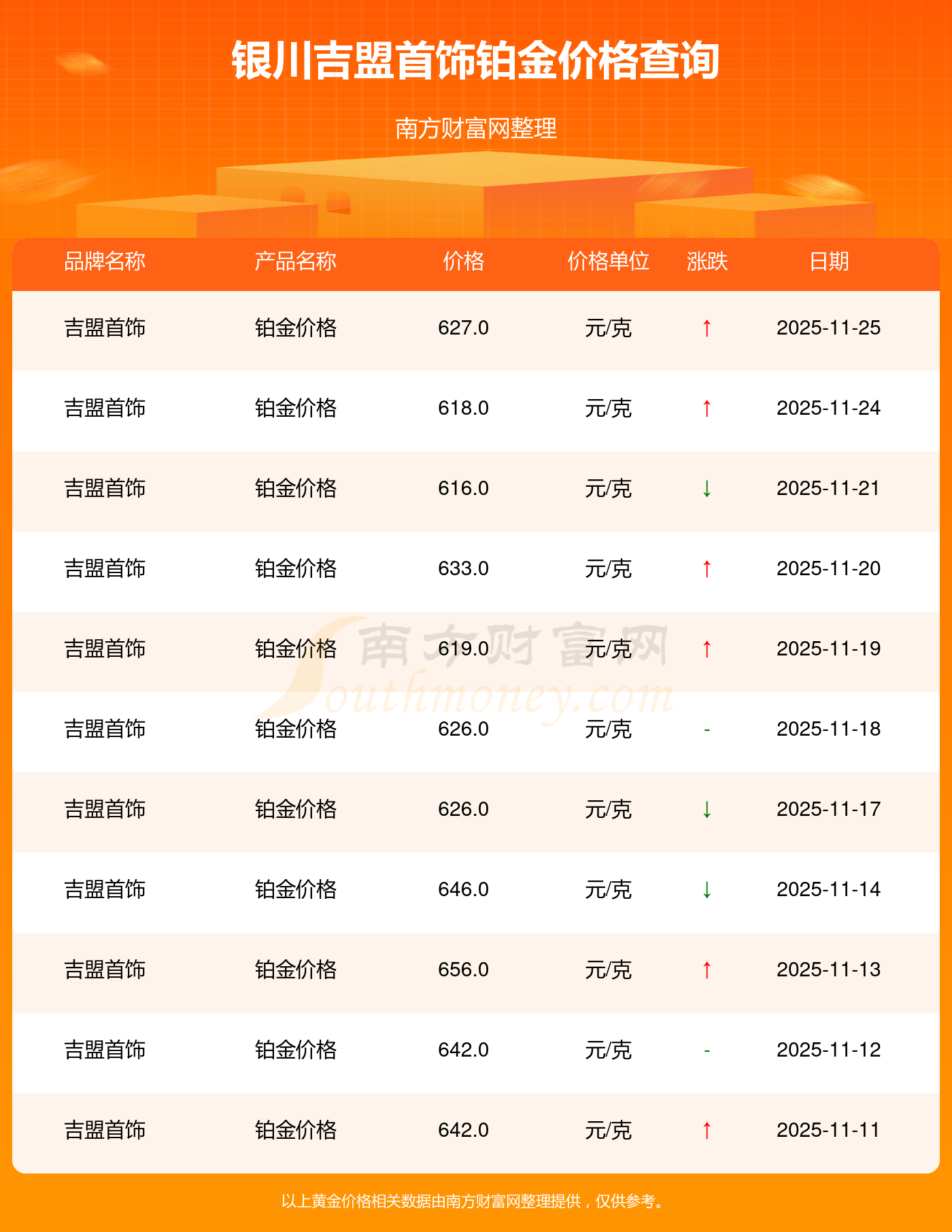 今日(2025年11月25日),銀川吉盟首飾鉑金價格的定價為 627.0元/克。