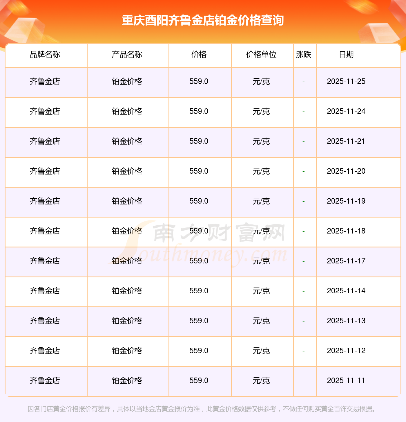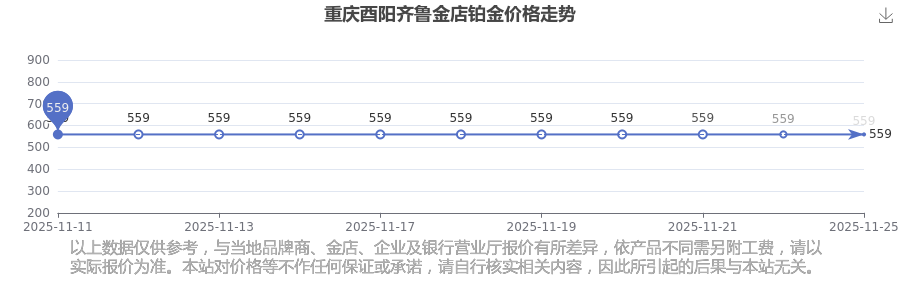 重慶酉陽齊魯金店鉑金價格在 2025年11月25日,其市場價格為 559.0元/克。