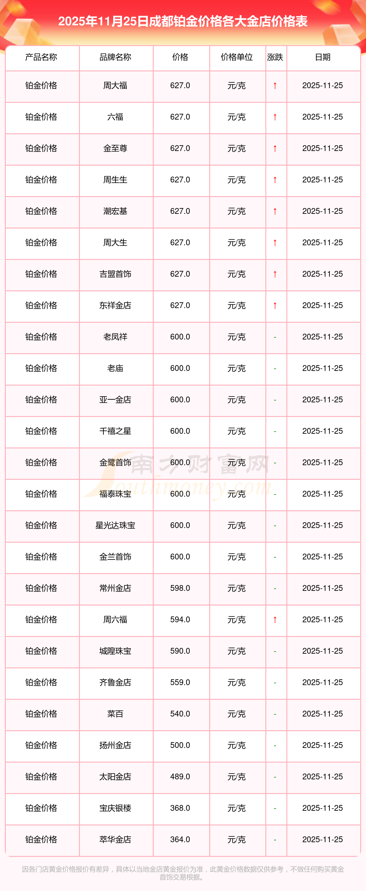 成都各大金店鉑金價格一覽,鉑金價格金價今日是多少最新公布