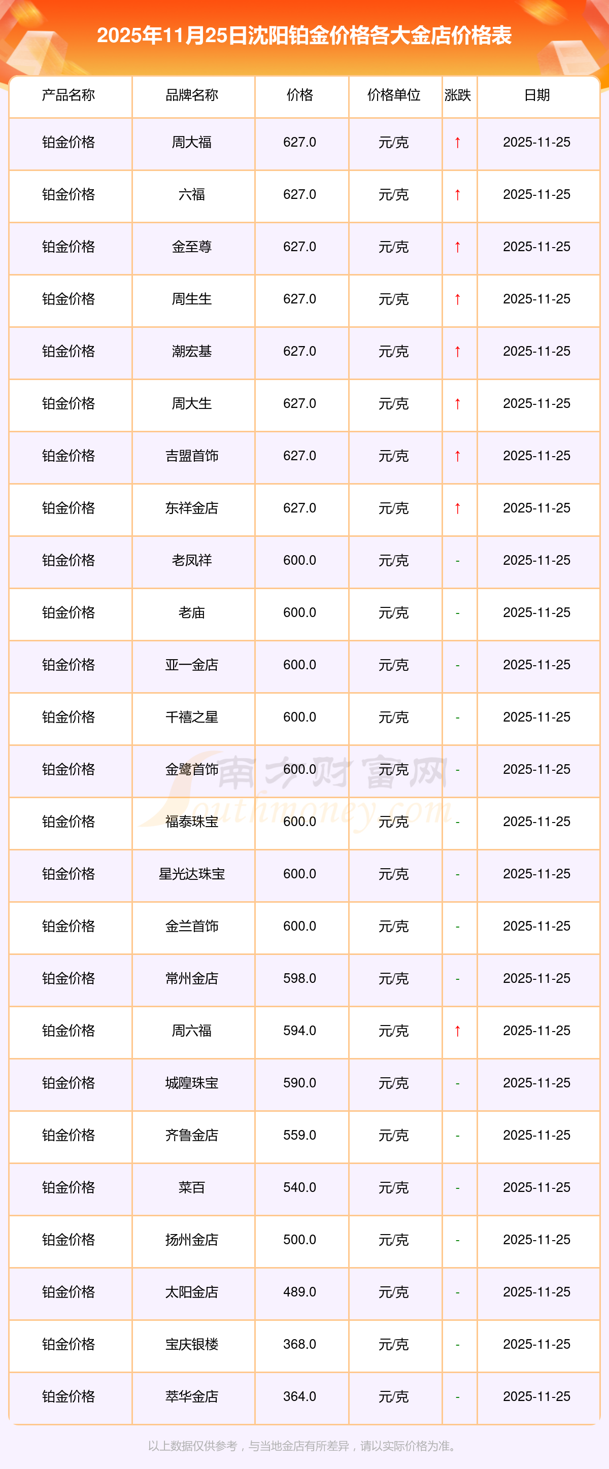 今天是2025年11月25日,沈陽(yáng)周大福、周大福、周大福、周大福、周大福、周大福、周大福、老鳳祥、老鳳祥、老鳳祥、周六福等各大金店品牌鉑金價(jià)格最新價(jià)格行情是這樣的:周大福1312.0元/克、周大福627.0元/克、周大福1312.0元/克、周大福45780.0、周大福17900.0、周大福41290.0、周大福1148.0元/克、老鳳祥1315.0元/克、老鳳祥600.0元/克、老鳳祥1315.0元/克、周六福1278.0元/克。