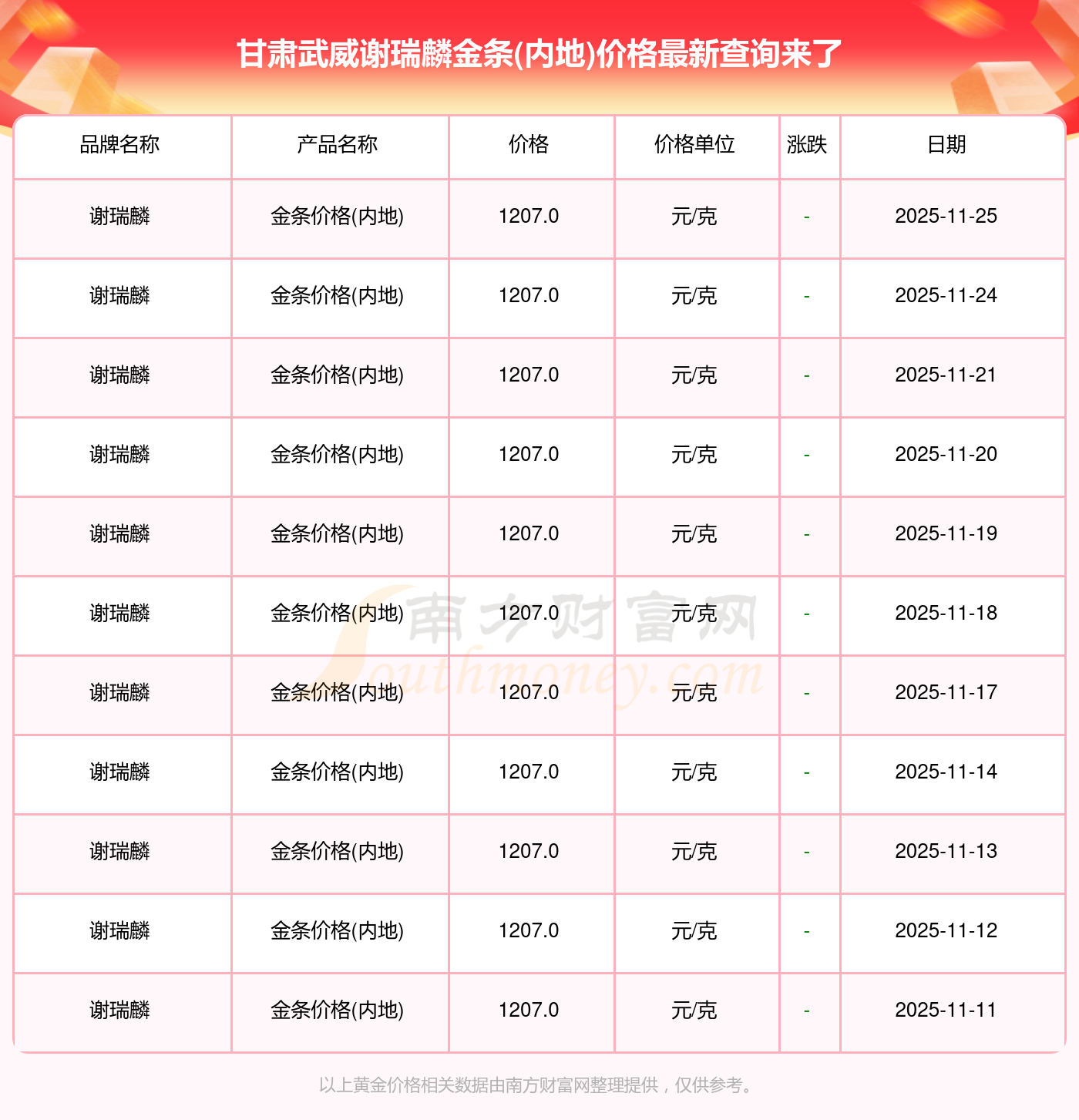 甘肅武威謝瑞麟 2025年11月25日的金條價(jià)格(內(nèi)地)價(jià)位為 1207.0元/克。