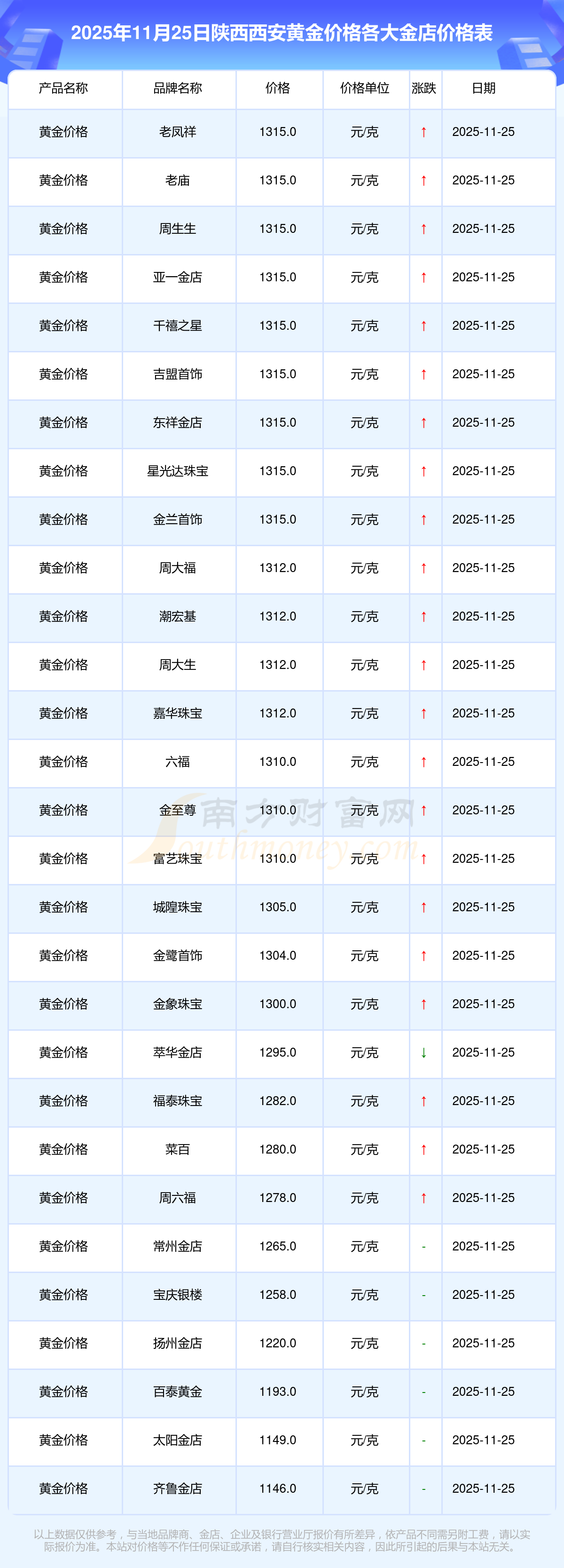 2025年11月25日陜西西安周大福、周大福、周大福、周大福、周大福、周大福、周大福、老鳳祥、老鳳祥、老鳳祥、周六福等各大金店品牌黃金價(jià)格最新價(jià)格如下:周大福黃金價(jià)格1312.0元/克,周大福鉑金價(jià)格627.0元/克,周大福飾品金價(jià)(內(nèi)地)1312.0元/克,周大福黃金飾品(香港)45780.0,周大福鉑金價(jià)格(香港)17900.0,周大福金條價(jià)格(香港)41290.0,周大福金條金價(jià)(內(nèi)地)1148.0元/克,老鳳祥黃金價(jià)格1315.0元/克,老鳳祥鉑金價(jià)格600.0元/克,老鳳祥足金價(jià)格1315.0元/克,周六福黃金價(jià)格1278.0元/克。