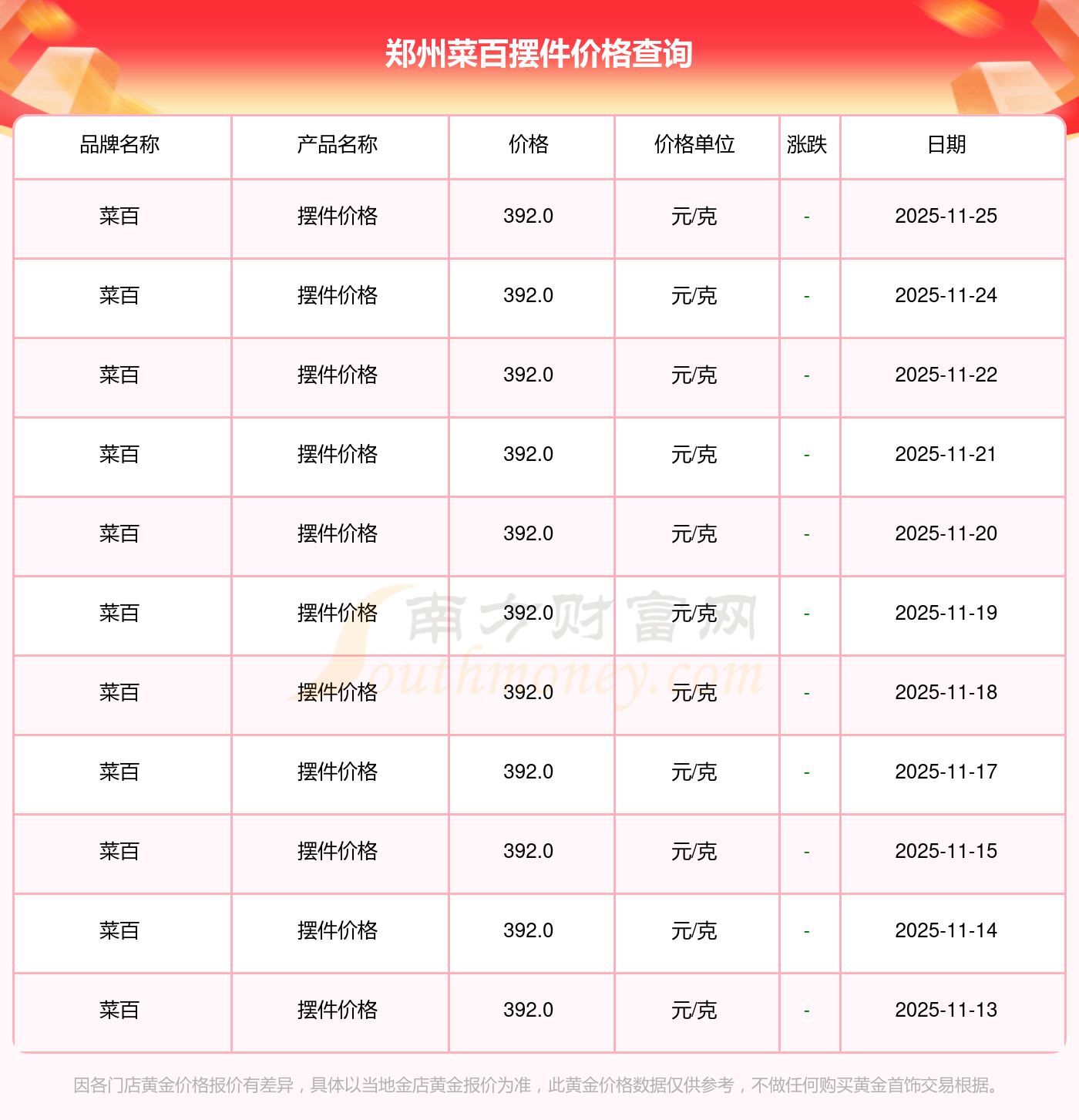 鄭州菜百擺件價格在 2025年11月25日為 392.0元/克。