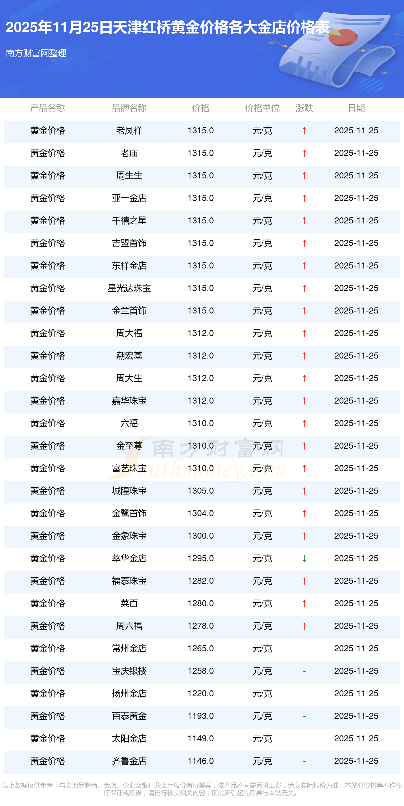 以上數(shù)據(jù)僅供參考,與當(dāng)?shù)仄放粕、金店、企業(yè)及銀行營業(yè)廳報(bào)價(jià)有所差異,依產(chǎn)品不同需另附工費(fèi),請(qǐng)以實(shí)際報(bào)價(jià)為準(zhǔn)。本站對(duì)價(jià)格等不作任何保證或承諾,請(qǐng)自行核實(shí)相關(guān)內(nèi)容,因此所引起的后果與本站無關(guān)。