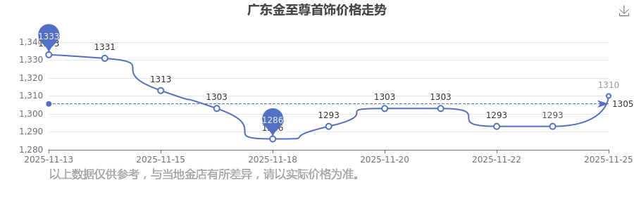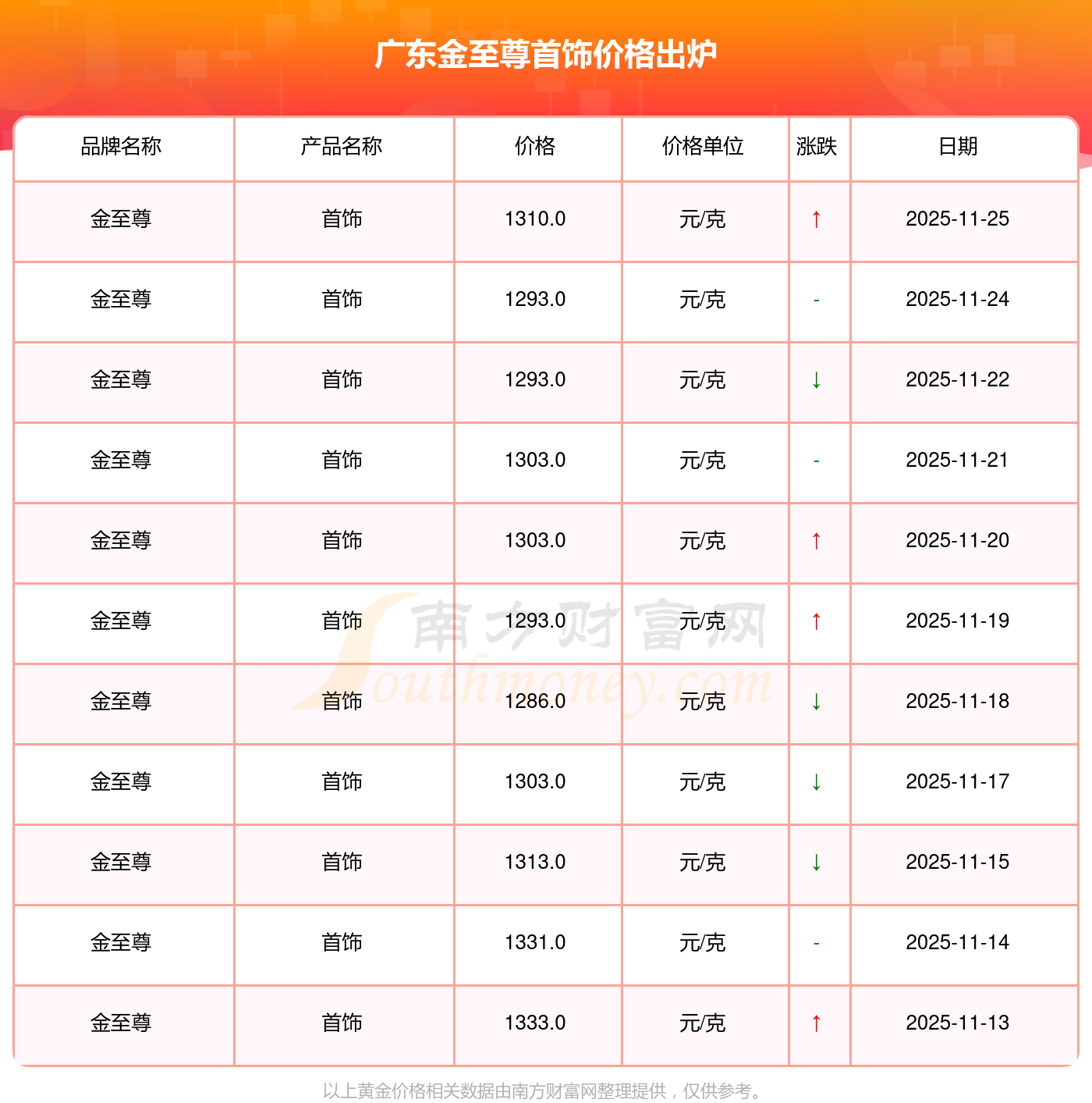 今日(2025年11月25日),廣東金至尊首飾每克的價(jià)值為1310.0元/克。