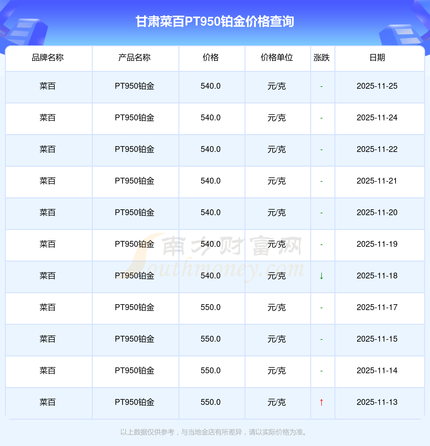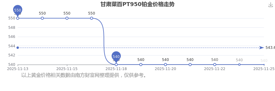 今日(2025年11月25日),甘肅菜百PT950鉑金的定價為 540.0元/克。