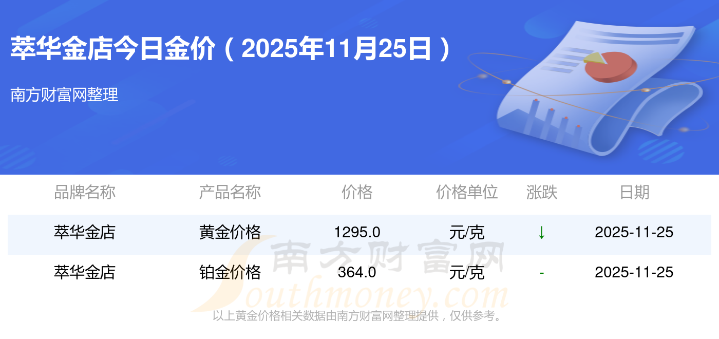 現(xiàn)在萃華金店黃金價格是多少錢1克_2025年萃華金店今日金價是多少錢一克,最新萃華金店查詢,2025年11月25日萃華金店鉑金價格現(xiàn)在每克多少錢?最新萃華金店鉑金價格報價公布,一起來看看吧!