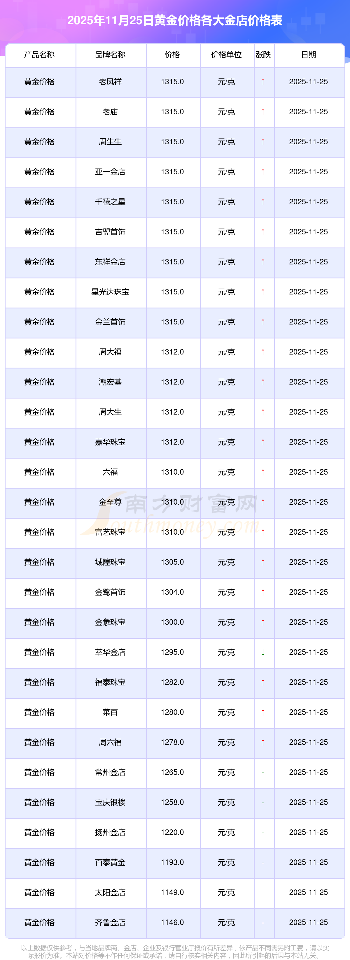 今天是2025年11月25日,周大福、周大福、周大福、周大福、周大福、周大福、周大福、老鳳祥、老鳳祥、老鳳祥、周六福等各大金店品牌黃金價格最新價格如下:周大福1312.0元/克、周大福627.0元/克、周大福1312.0元/克、周大福45780.0、周大福17900.0、周大福41290.0、周大福1148.0元/克、老鳳祥1315.0元/克、老鳳祥600.0元/克、老鳳祥1315.0元/克、周六福1278.0元/克。