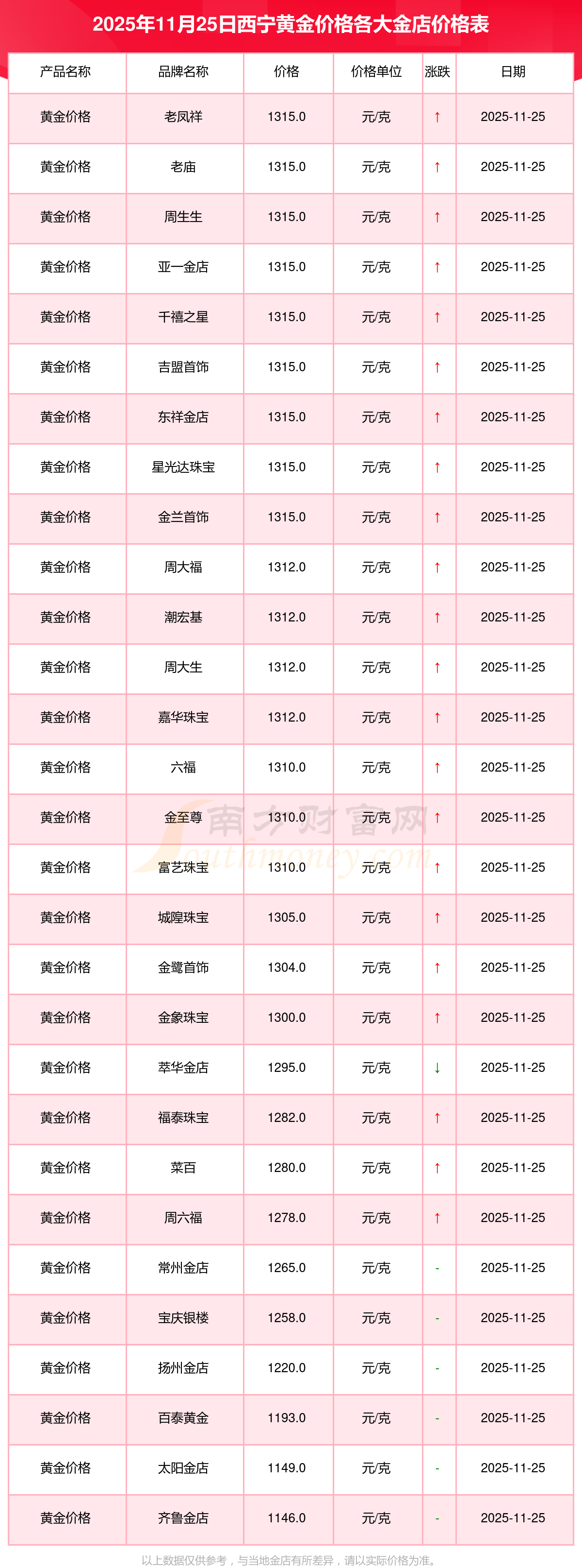 今天是2025年11月25日,西寧周大福、周大福、周大福、周大福、周大福、周大福、周大福、老鳳祥、老鳳祥、老鳳祥、周六福等各大金店品牌黃金價(jià)格最新價(jià)格如下:周大福1312.0元/克、周大福627.0元/克、周大福1312.0元/克、周大福45780.0、周大福17900.0、周大福41290.0、周大福1148.0元/克、老鳳祥1315.0元/克、老鳳祥600.0元/克、老鳳祥1315.0元/克、周六福1278.0元/克。