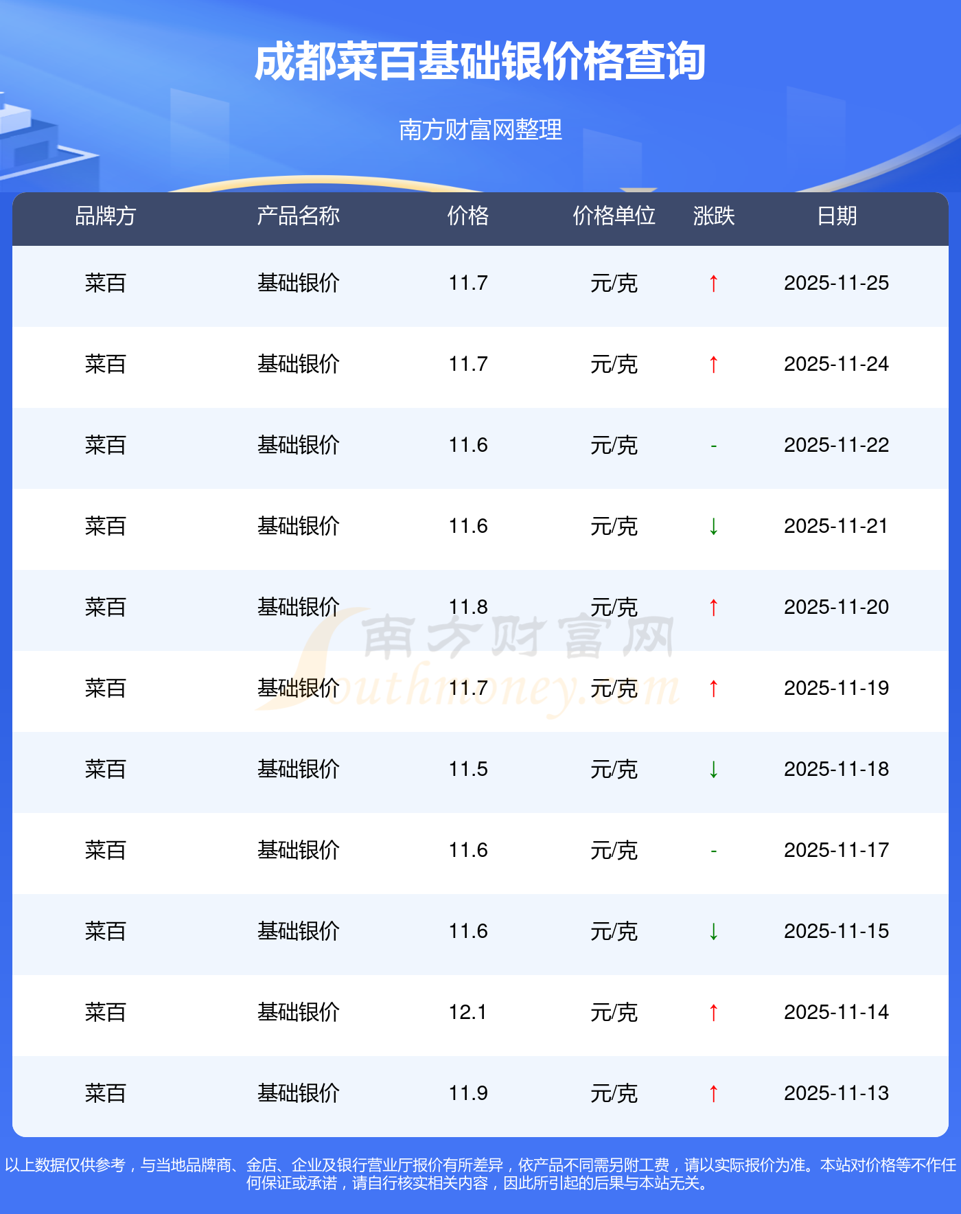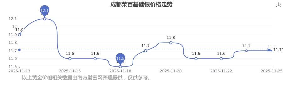 2025年11月25日成都菜百基礎銀價格為11.7元/克。