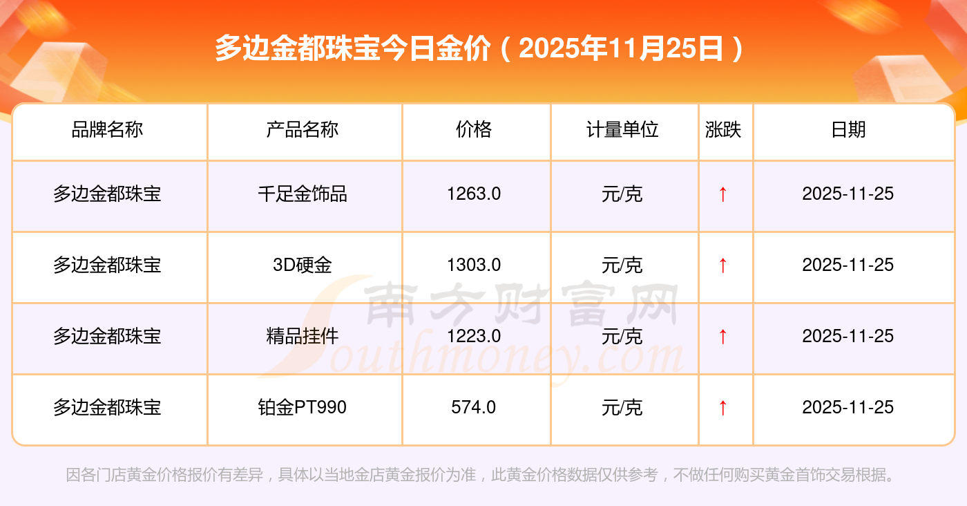 2025年11月25日多邊金都珠寶今日價(jià)格:黃金價(jià)格1312.0元/克,鉑金價(jià)格627.0元/克,飾品金價(jià)(內(nèi)地)1312.0元/克,黃金飾品(香港)45780.0,鉑金價(jià)格(香港)17900.0,金條價(jià)格(香港)41290.0,金條金價(jià)(內(nèi)地)1148.0元/克,黃金價(jià)格1315.0元/克,鉑金價(jià)格600.0元/克,足金價(jià)格1315.0元/克,黃金價(jià)格1278.0元/克。