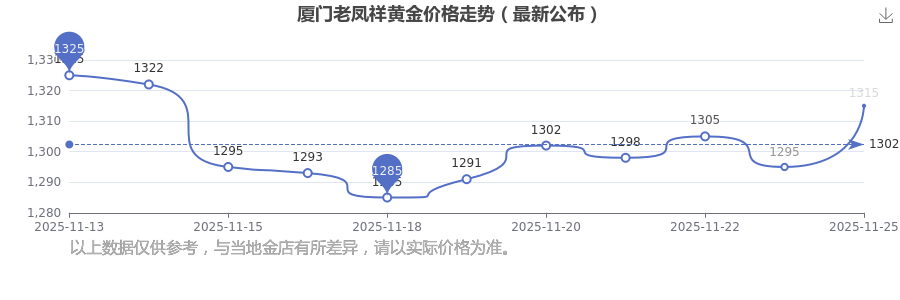 今日2025年11月25日,廈門老鳳祥黃金價(jià)格為1315.0元/克。