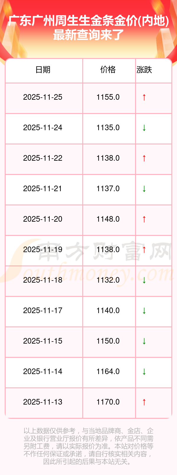 2025年11月25日,周大福、周大福、周大福、周大福、周大福、周大福、周大福、老鳳祥、老鳳祥、老鳳祥、周六福等各大金店品牌金條金價(jià)(內(nèi)地)今日價(jià)格如下:周大福1312.0元/克、周大福627.0元/克、周大福1312.0元/克、周大福45780.0、周大福17900.0、周大福41290.0、周大福1148.0元/克、老鳳祥1315.0元/克、老鳳祥600.0元/克、老鳳祥1315.0元/克、周六福1278.0元/克。