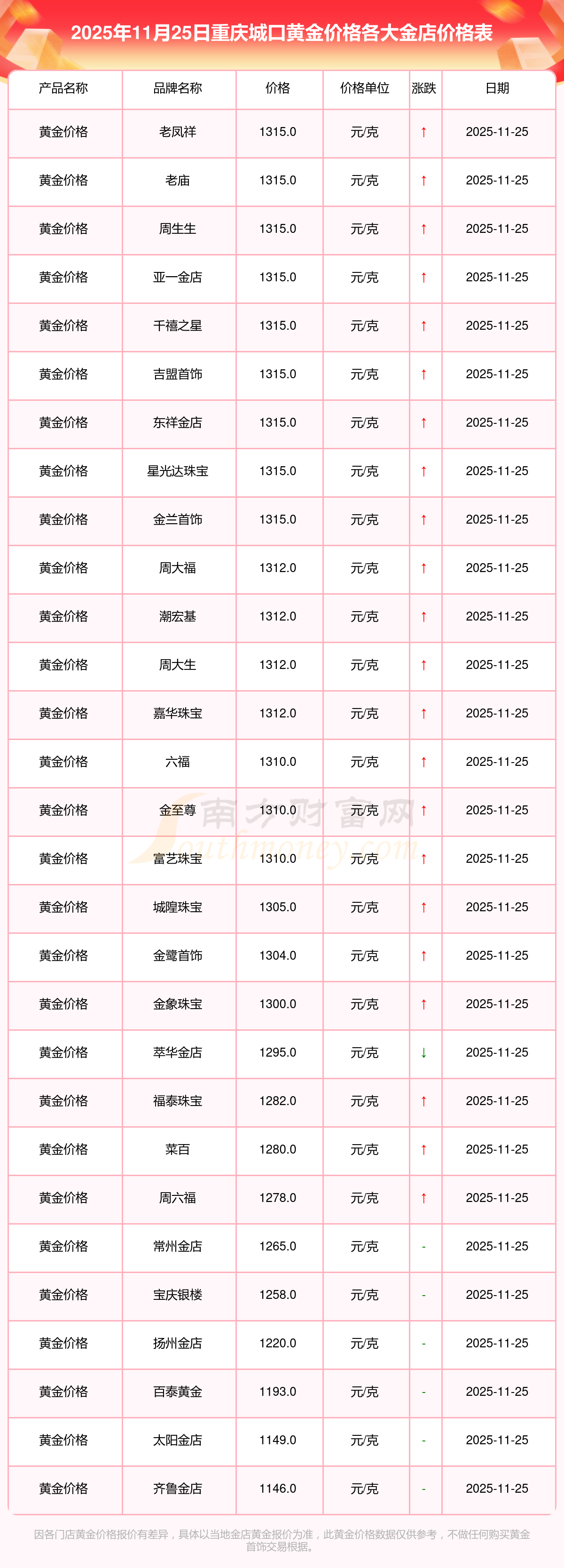 2025年11月25日重慶城口周大福、周大福、周大福、周大福、周大福、周大福、周大福、老鳳祥、老鳳祥、老鳳祥、周六福等各大金店品牌黃金價(jià)格最新價(jià)格行情來(lái)了,如下:周大福黃金價(jià)格1312.0元/克,周大福鉑金價(jià)格627.0元/克,周大福飾品金價(jià)(內(nèi)地)1312.0元/克,周大福黃金飾品(香港)45780.0,周大福鉑金價(jià)格(香港)17900.0,周大福金條價(jià)格(香港)41290.0,周大福金條金價(jià)(內(nèi)地)1148.0元/克,老鳳祥黃金價(jià)格1315.0元/克,老鳳祥鉑金價(jià)格600.0元/克,老鳳祥足金價(jià)格1315.0元/克,周六福黃金價(jià)格1278.0元/克。