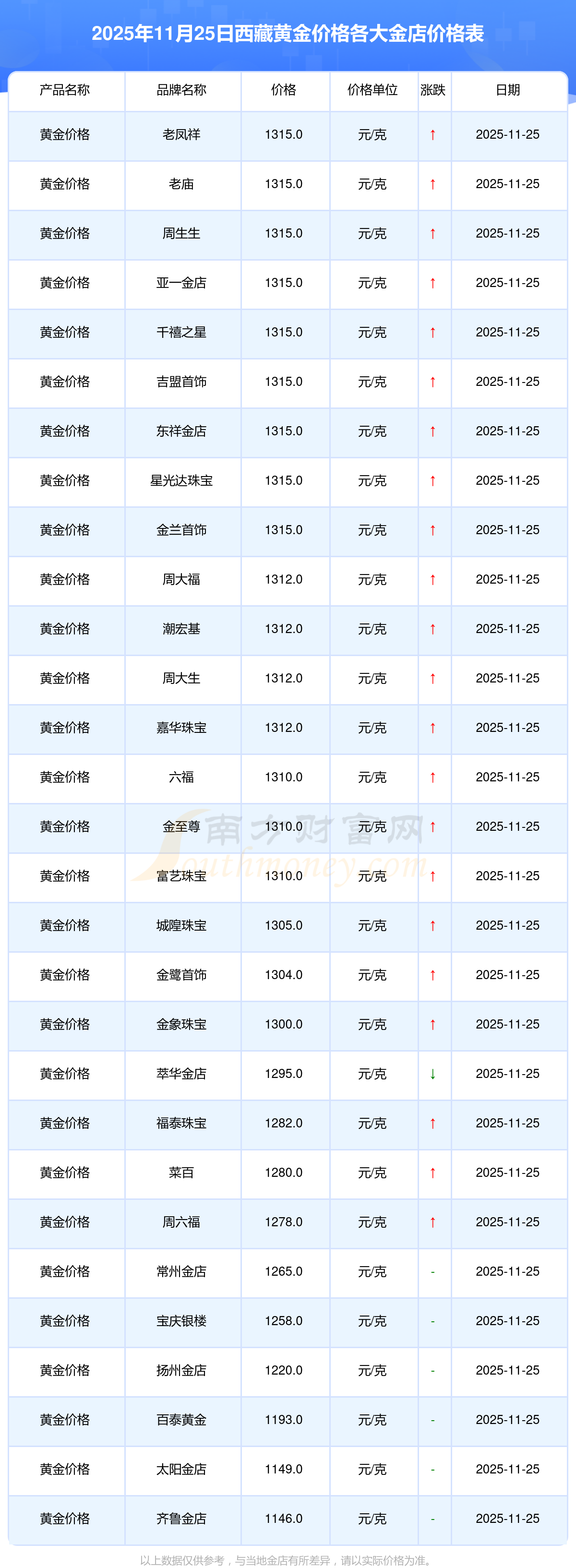 今天是2025年11月25日,西藏周大福、周大福、周大福、周大福、周大福、周大福、周大福、老鳳祥、老鳳祥、老鳳祥、周六福等各大金店品牌黃金價格最新價格行情是這樣的:周大福1312.0元/克、周大福627.0元/克、周大福1312.0元/克、周大福45780.0、周大福17900.0、周大福41290.0、周大福1148.0元/克、老鳳祥1315.0元/克、老鳳祥600.0元/克、老鳳祥1315.0元/克、周六福1278.0元/克。