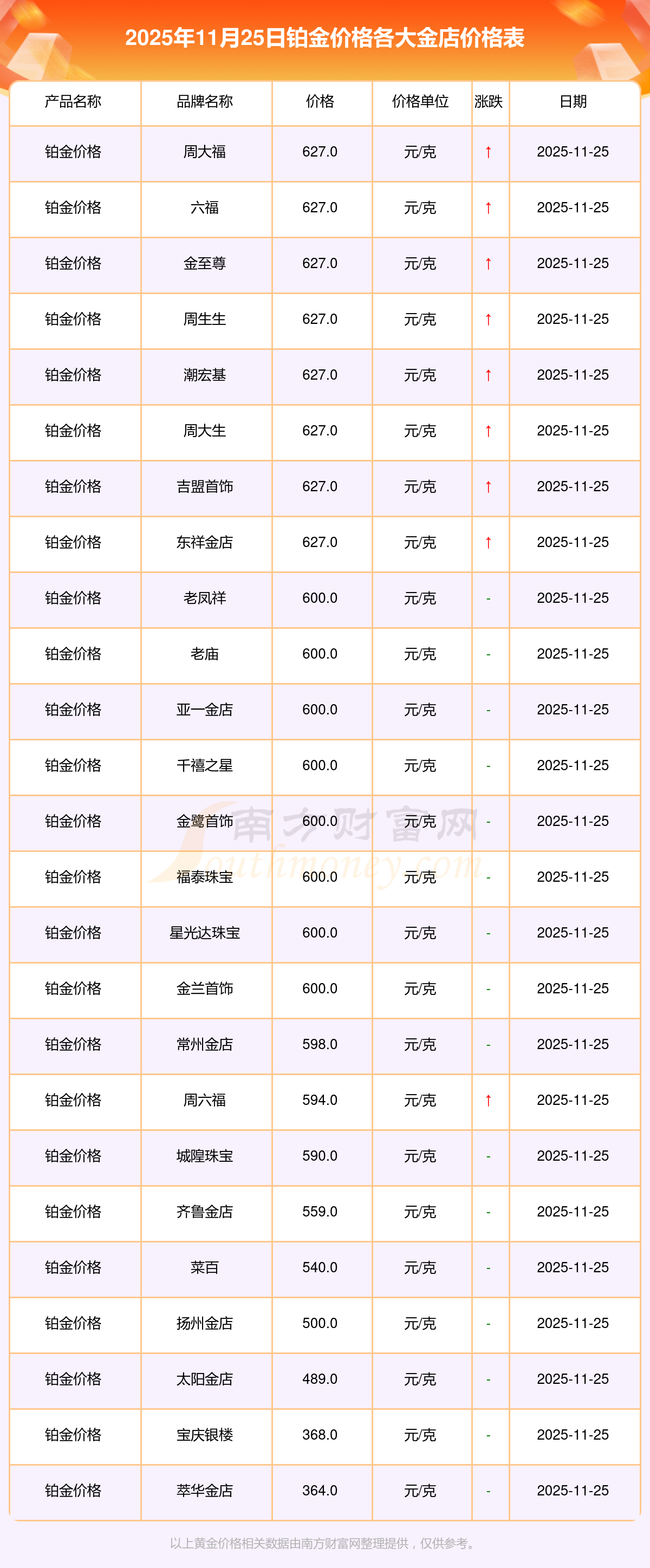 今日鉑金價(jià)格表_2025年11月25日各金店鉑金價(jià)格多少1克?一起來(lái)看看吧!