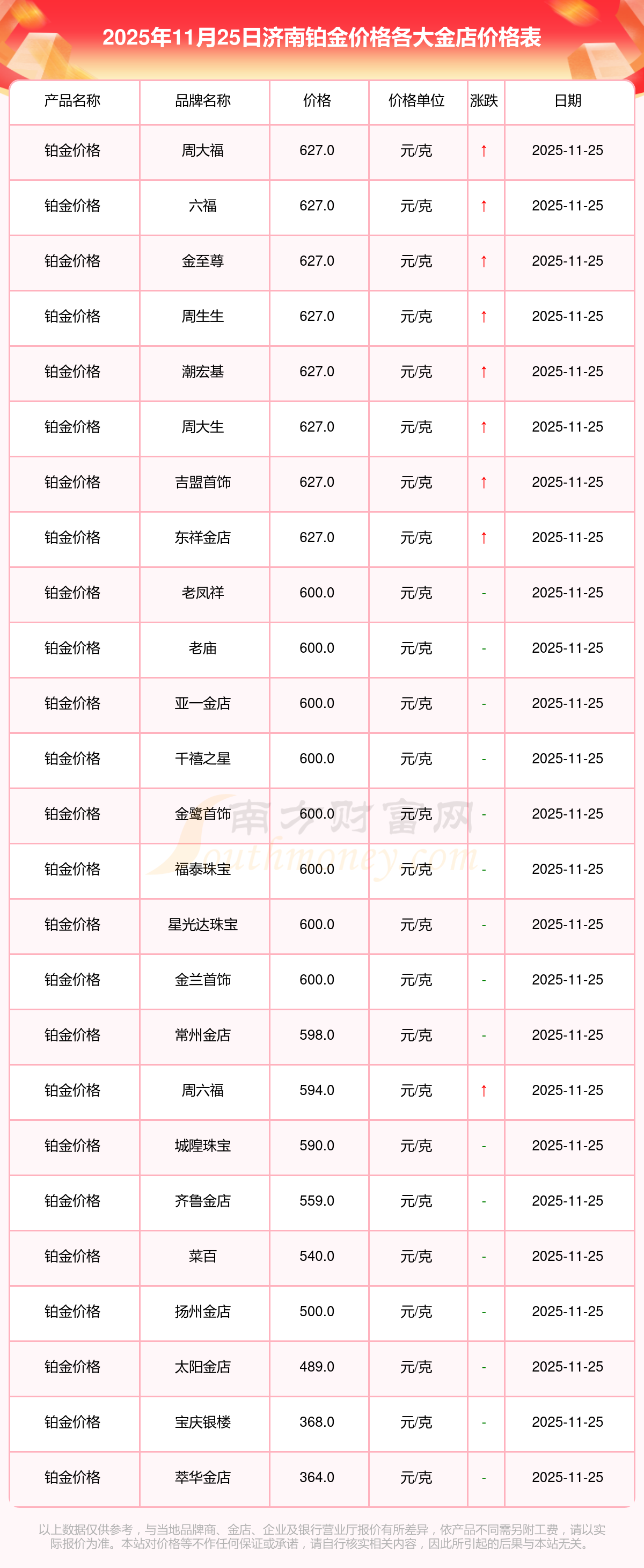 各地金店的金價一樣嗎?2025年11月25日濟南各金店鉑金價格表來了