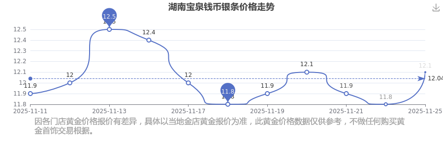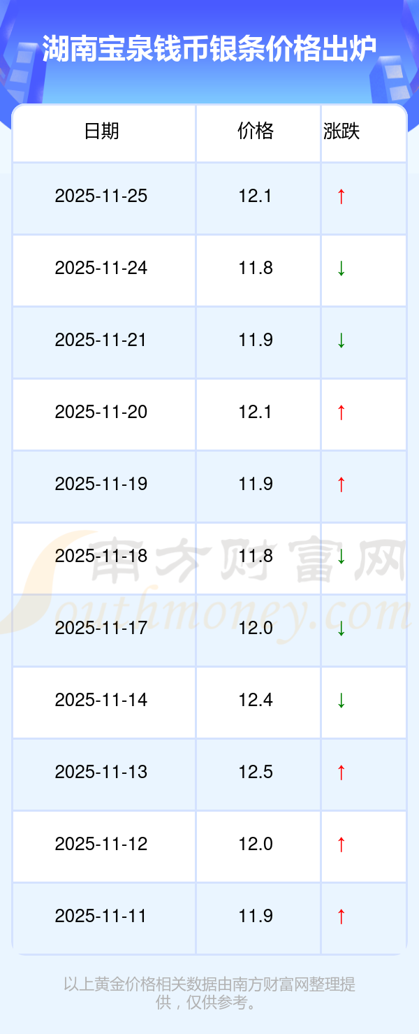 12.1元/克,這是湖南寶泉錢幣于 2025年11月25日所定的銀條價(jià)格。