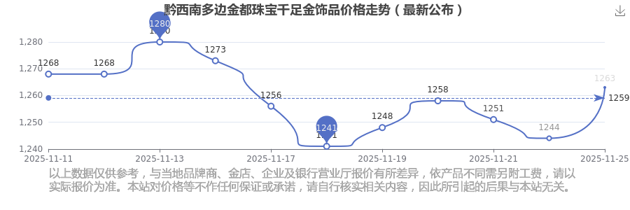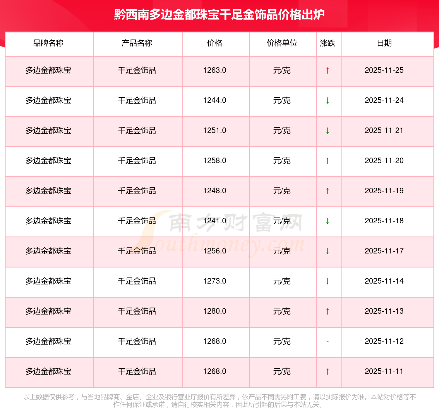 今日黔西南多邊金都珠寶千足金飾品價格是1263.0元/克。