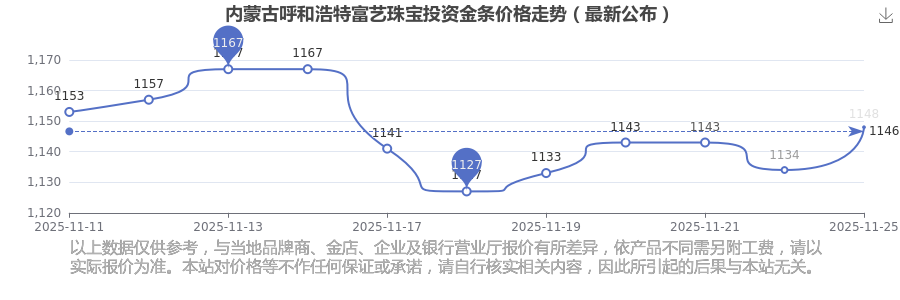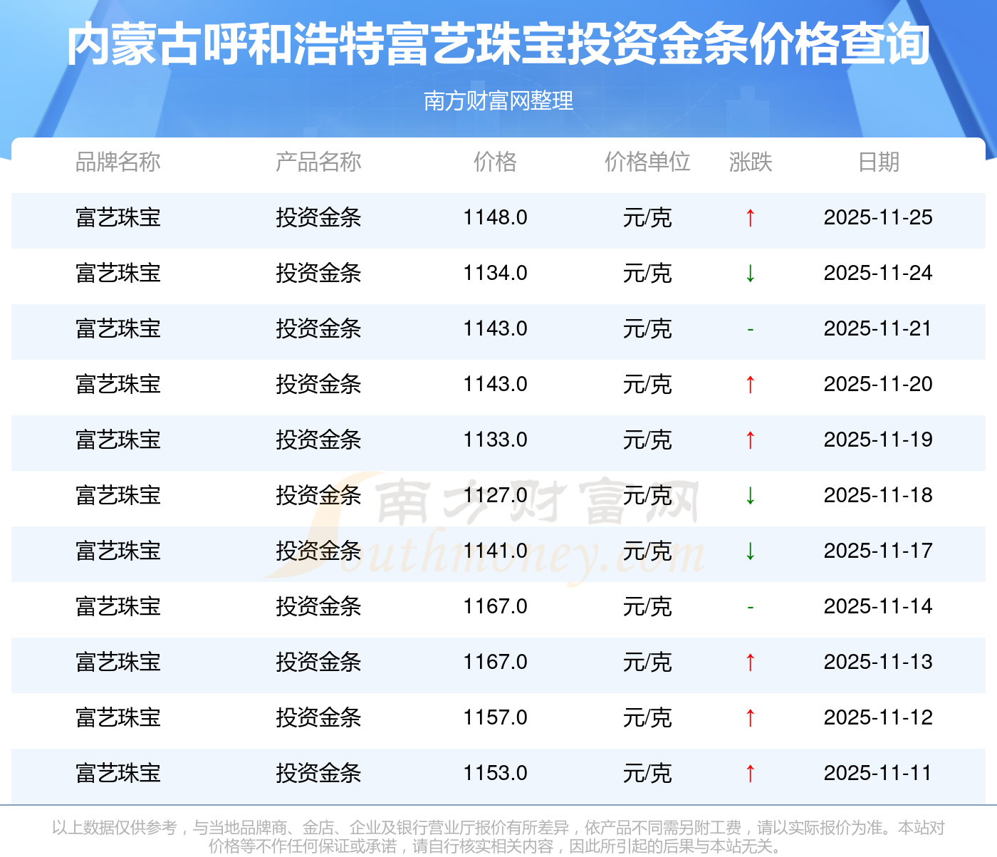 今日2025年11月25日,內(nèi)蒙古呼和浩特富藝珠寶投資金條價格為1148.0元/克。