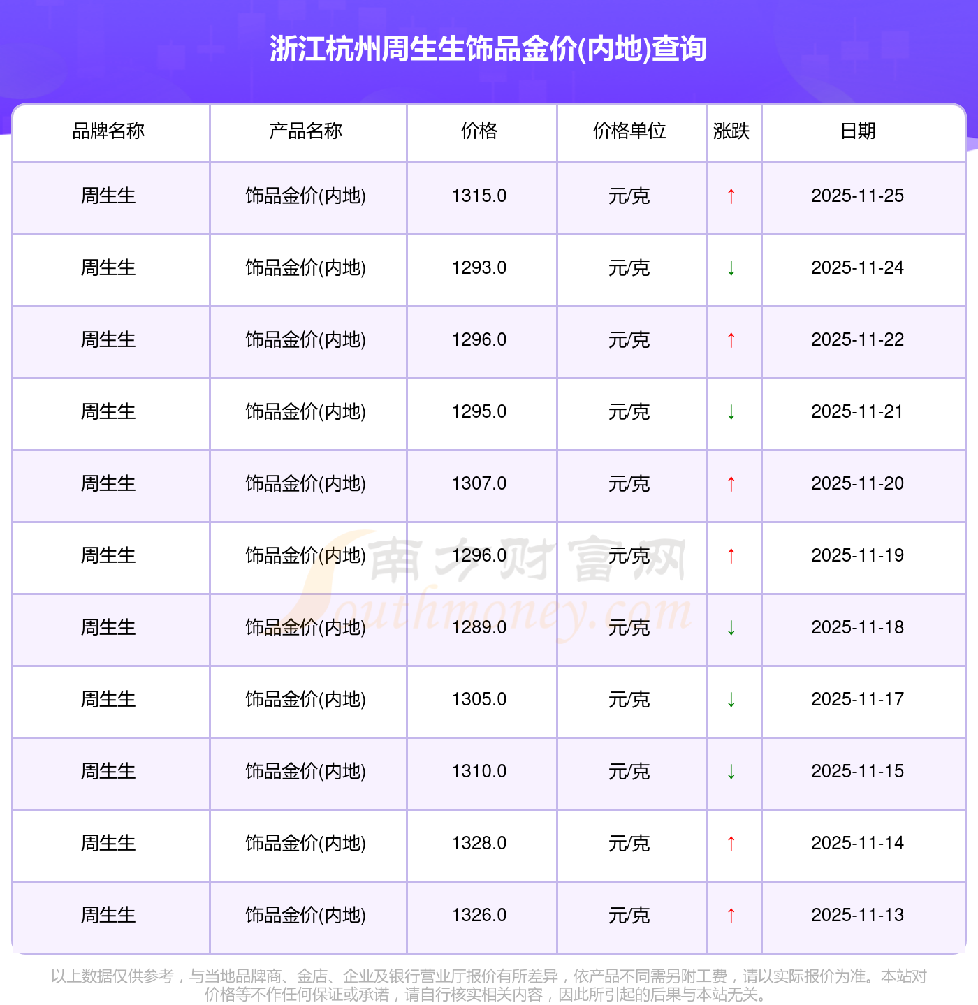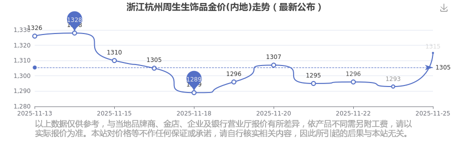 今日(2025年11月25日)浙江杭州周生生飾品金價(內地)最新價格為1315.0元/克。