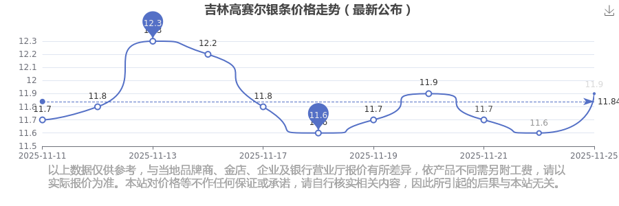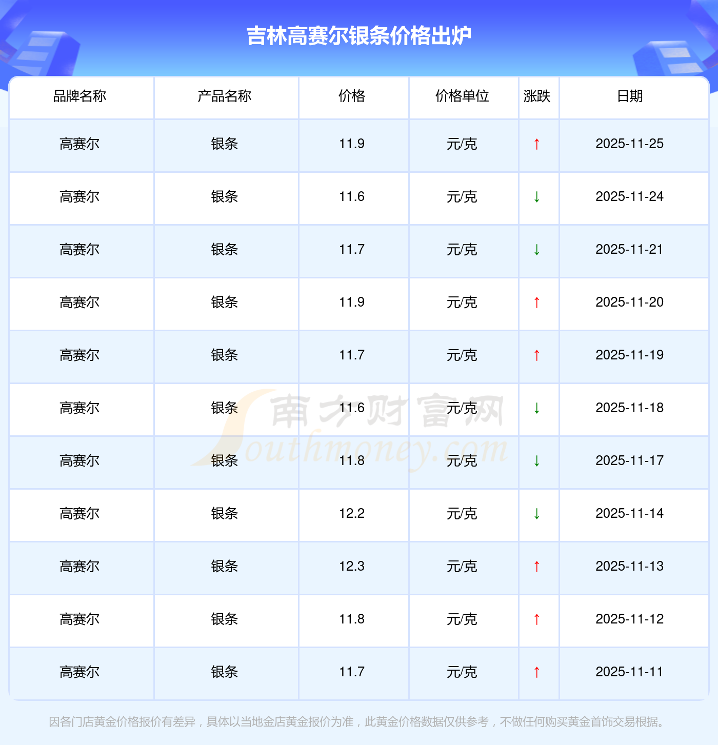 2025年11月25日吉林高賽爾銀條價(jià)格:11.9元/克。