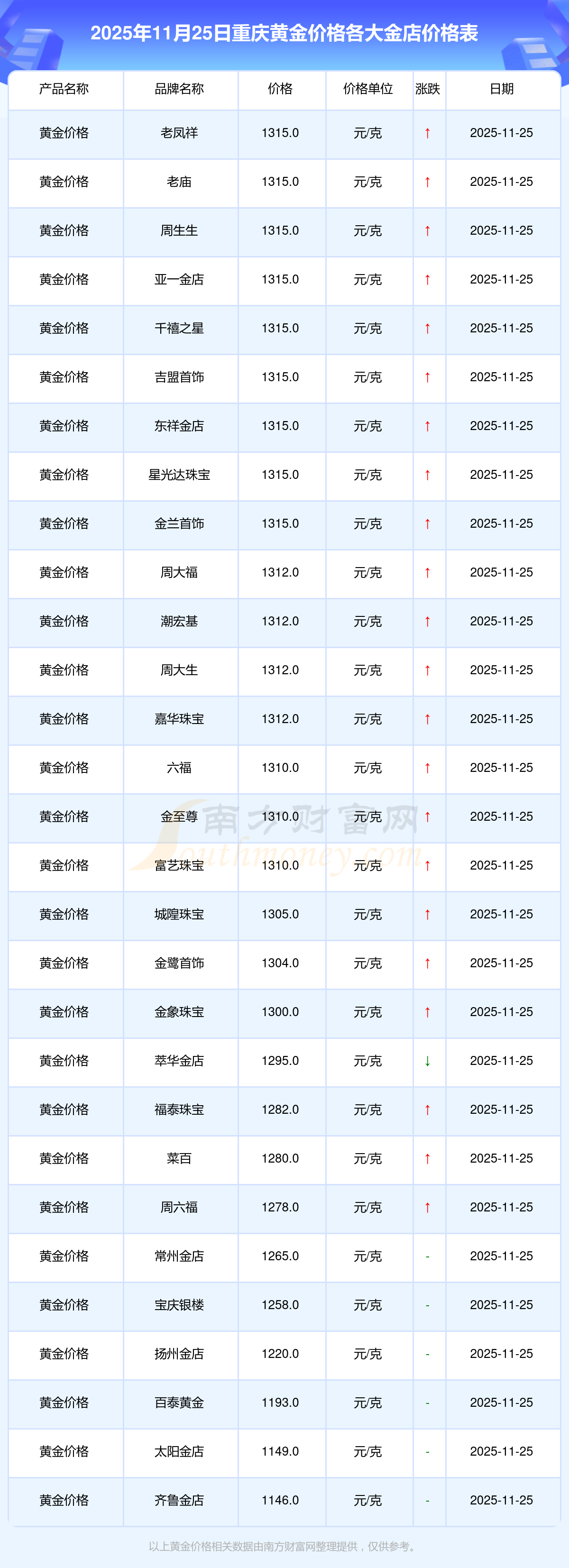 今天是2025年11月25日,重慶周大福、周大福、周大福、周大福、周大福、周大福、周大福、老鳳祥、老鳳祥、老鳳祥、周六福等各大金店品牌黃金價格最新價格如下:周大福1312.0元/克、周大福627.0元/克、周大福1312.0元/克、周大福45780.0、周大福17900.0、周大福41290.0、周大福1148.0元/克、老鳳祥1315.0元/克、老鳳祥600.0元/克、老鳳祥1315.0元/克、周六福1278.0元/克。