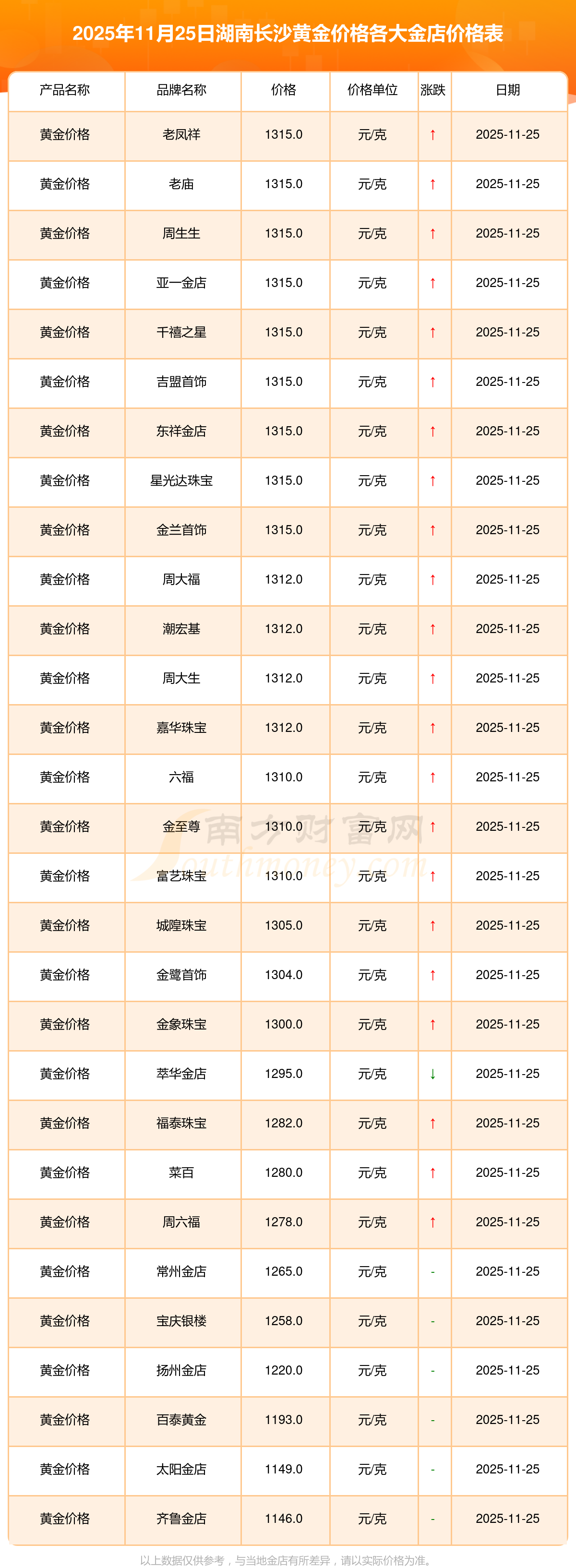 2025年11月25日湖南長沙周大福、周大福、周大福、周大福、周大福、周大福、周大福、老鳳祥、老鳳祥、老鳳祥、周六福等各大金店品牌黃金價格最新價格如下:周大福黃金價格1312.0元/克,周大福鉑金價格627.0元/克,周大福飾品金價(內(nèi)地)1312.0元/克,周大福黃金飾品(香港)45780.0,周大福鉑金價格(香港)17900.0,周大福金條價格(香港)41290.0,周大福金條金價(內(nèi)地)1148.0元/克,老鳳祥黃金價格1315.0元/克,老鳳祥鉑金價格600.0元/克,老鳳祥足金價格1315.0元/克,周六福黃金價格1278.0元/克。