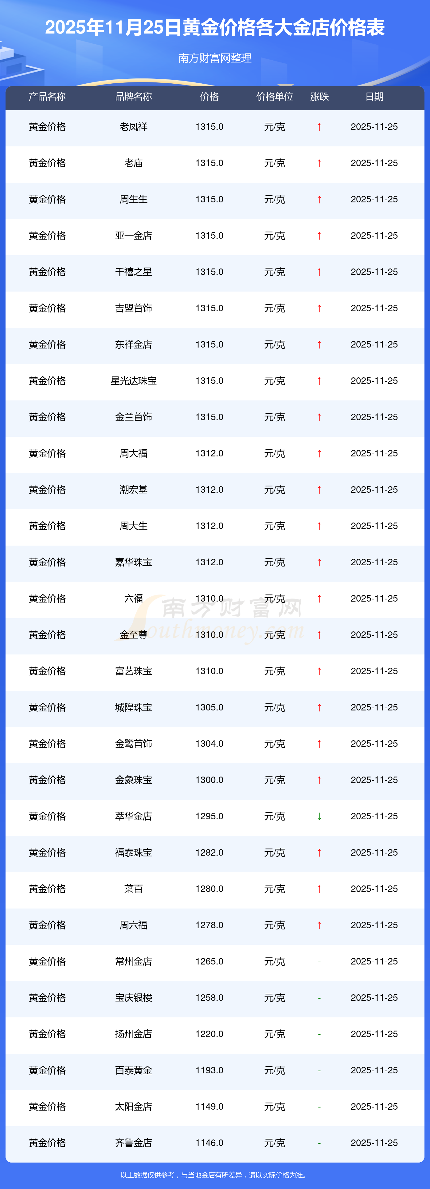2025年11月25日周大福、周大福、周大福、周大福、周大福、周大福、周大福、老鳳祥、老鳳祥、老鳳祥、周六福等各大金店品牌黃金價(jià)格最新價(jià)格如下:周大福黃金價(jià)格1312.0元/克,周大福鉑金價(jià)格627.0元/克,周大福飾品金價(jià)(內(nèi)地)1312.0元/克,周大福黃金飾品(香港)45780.0,周大福鉑金價(jià)格(香港)17900.0,周大福金條價(jià)格(香港)41290.0,周大福金條金價(jià)(內(nèi)地)1148.0元/克,老鳳祥黃金價(jià)格1315.0元/克,老鳳祥鉑金價(jià)格600.0元/克,老鳳祥足金價(jià)格1315.0元/克,周六福黃金價(jià)格1278.0元/克。