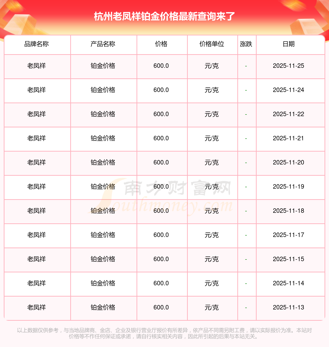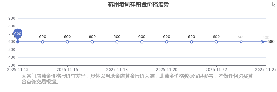今日2025年11月25日,杭州老鳳祥鉑金價(jià)格為600.0元/克。