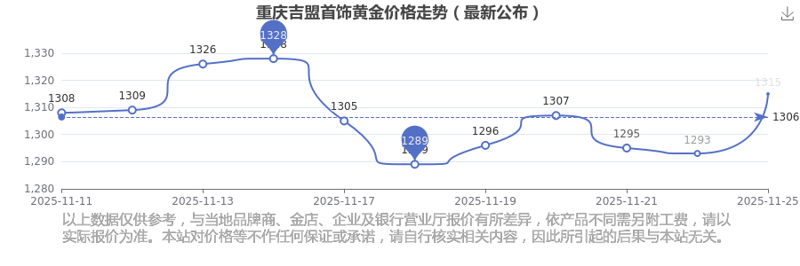 2025年11月25日重慶吉盟首飾黃金價格是1315.0元/克。