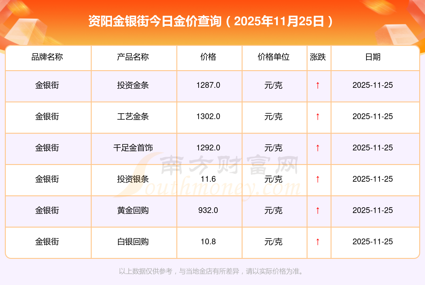 2025年11月25日資陽金銀街今日價(jià)格:黃金價(jià)格1312.0元/克,鉑金價(jià)格627.0元/克,飾品金價(jià)(內(nèi)地)1312.0元/克,黃金飾品(香港)45780.0,鉑金價(jià)格(香港)17900.0,金條價(jià)格(香港)41290.0,金條金價(jià)(內(nèi)地)1148.0元/克,黃金價(jià)格1315.0元/克,鉑金價(jià)格600.0元/克,足金價(jià)格1315.0元/克,黃金價(jià)格1278.0元/克。