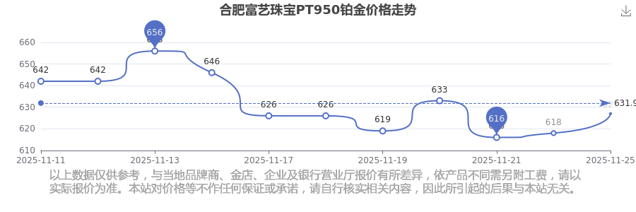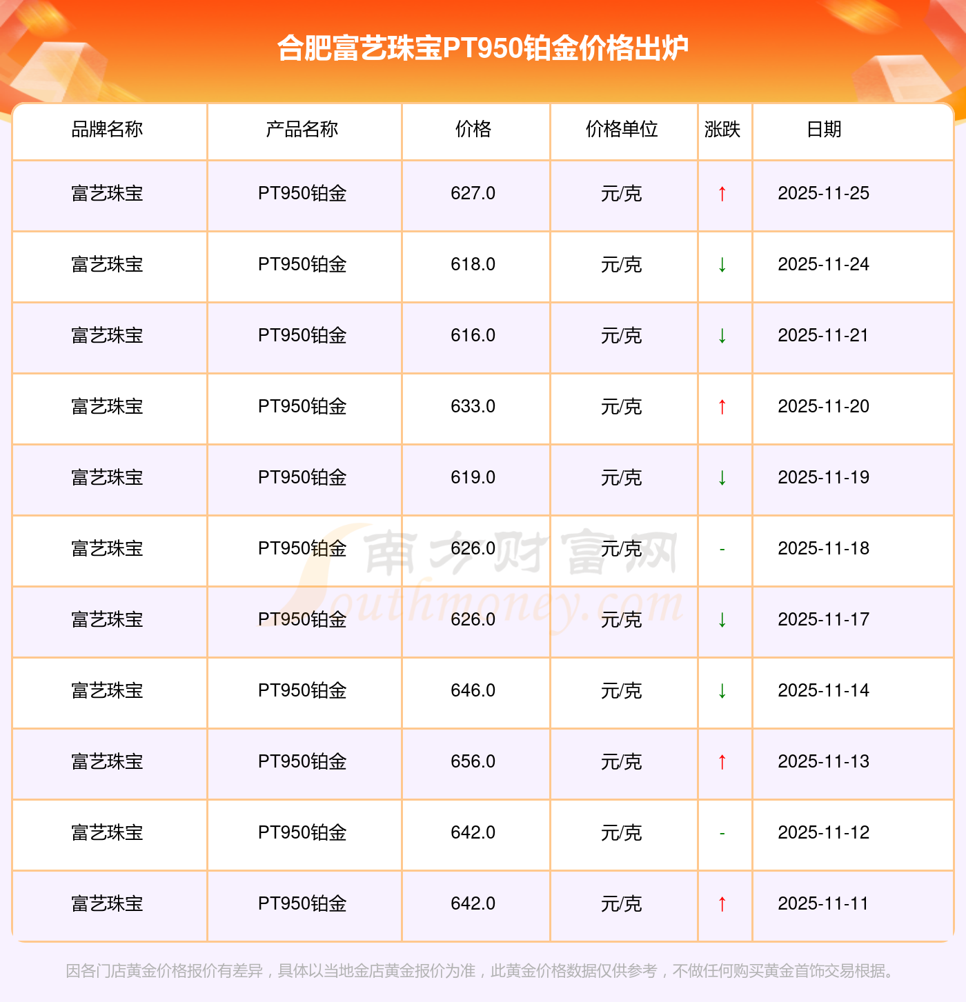 627.0元/克的PT950鉑金價(jià)格,是合肥富藝珠寶在 2025年11月25日給出的。