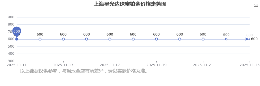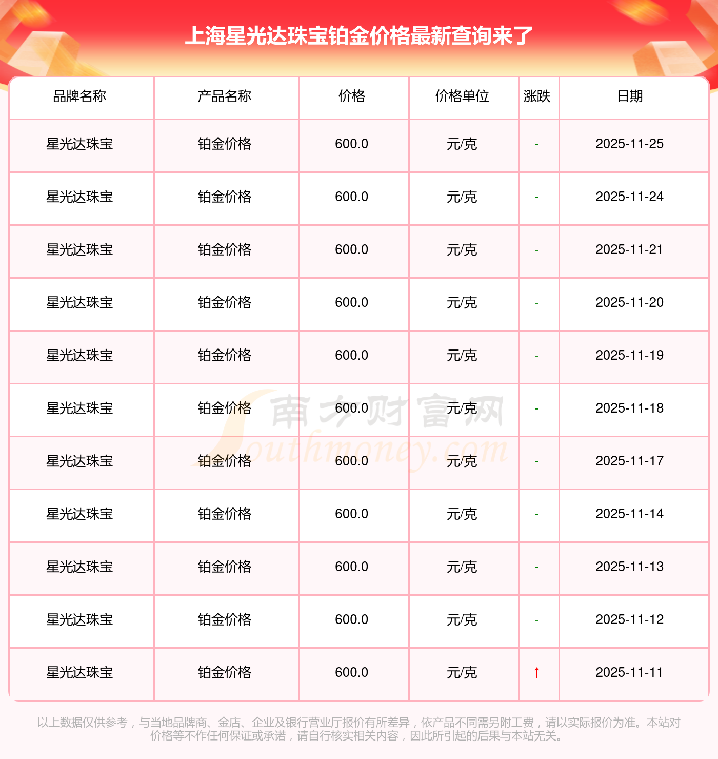 今日上海星光達(dá)珠寶鉑金價格:600.0元/克。