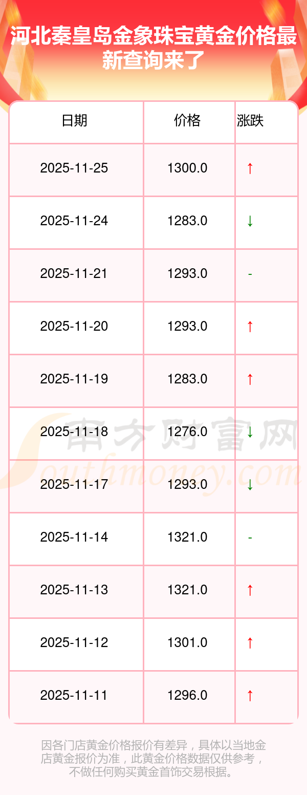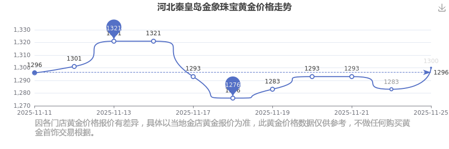 河北秦皇島金象珠寶在 2025年11月25日,黃金價格的售賣價格是 1300.0元/克。