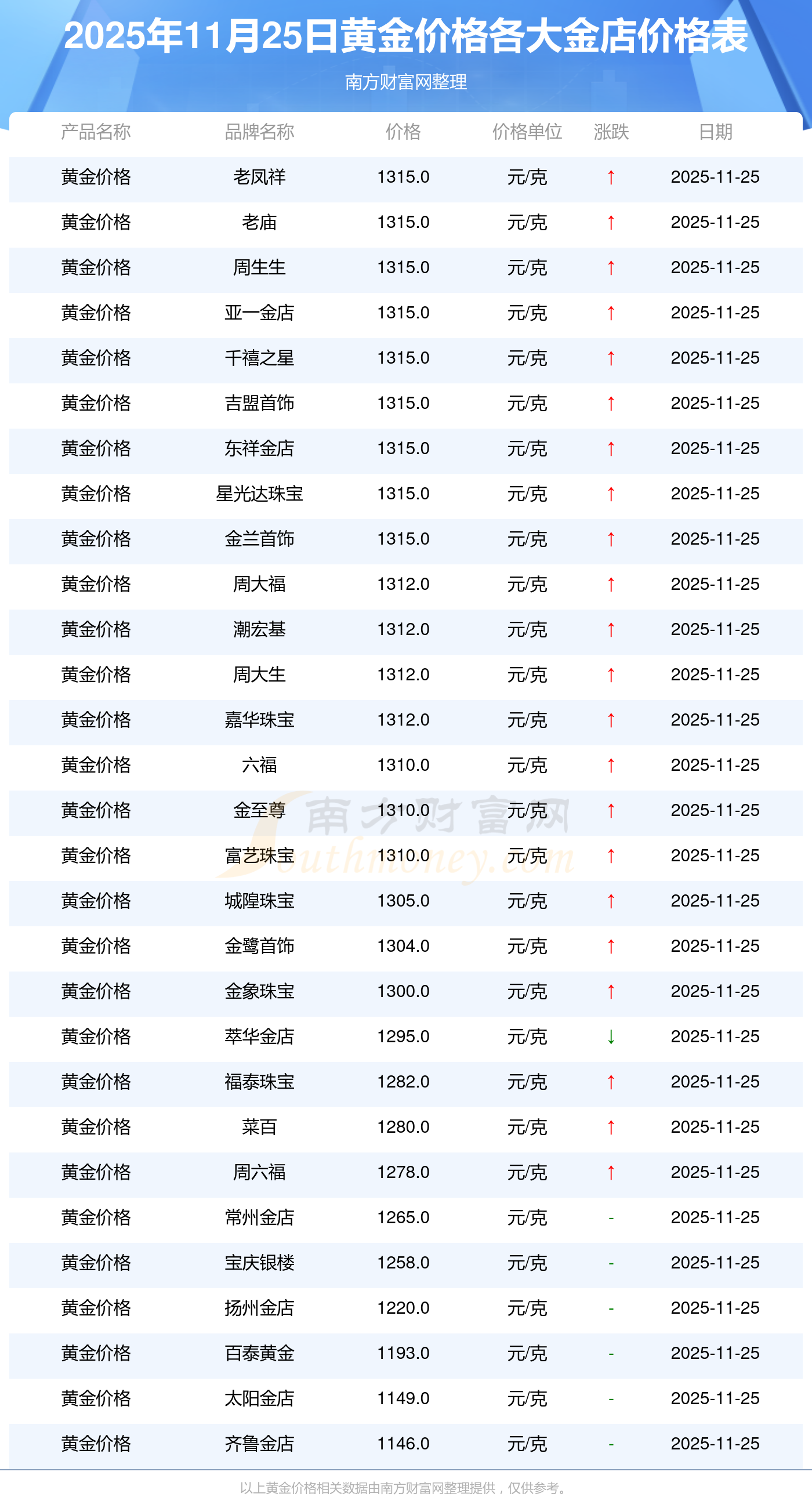 今天是2025年11月25日,周大福、周大福、周大福、周大福、周大福、周大福、周大福、老鳳祥、老鳳祥、老鳳祥、周六福等各大金店品牌黃金價(jià)格最新價(jià)格如下:周大福1312.0元/克、周大福627.0元/克、周大福1312.0元/克、周大福45780.0、周大福17900.0、周大福41290.0、周大福1148.0元/克、老鳳祥1315.0元/克、老鳳祥600.0元/克、老鳳祥1315.0元/克、周六福1278.0元/克。