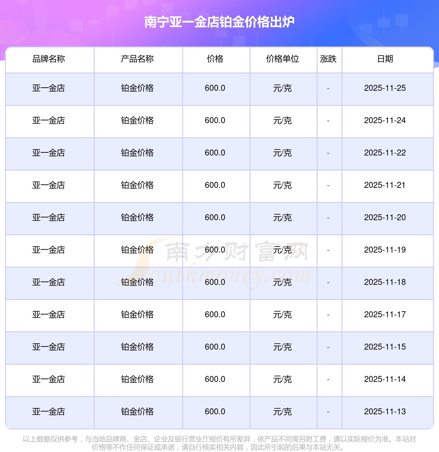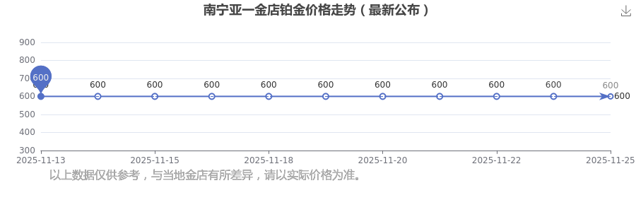 南寧亞一金店在 2025年11月25日的鉑金價(jià)格零售價(jià)格為 600.0元/克。