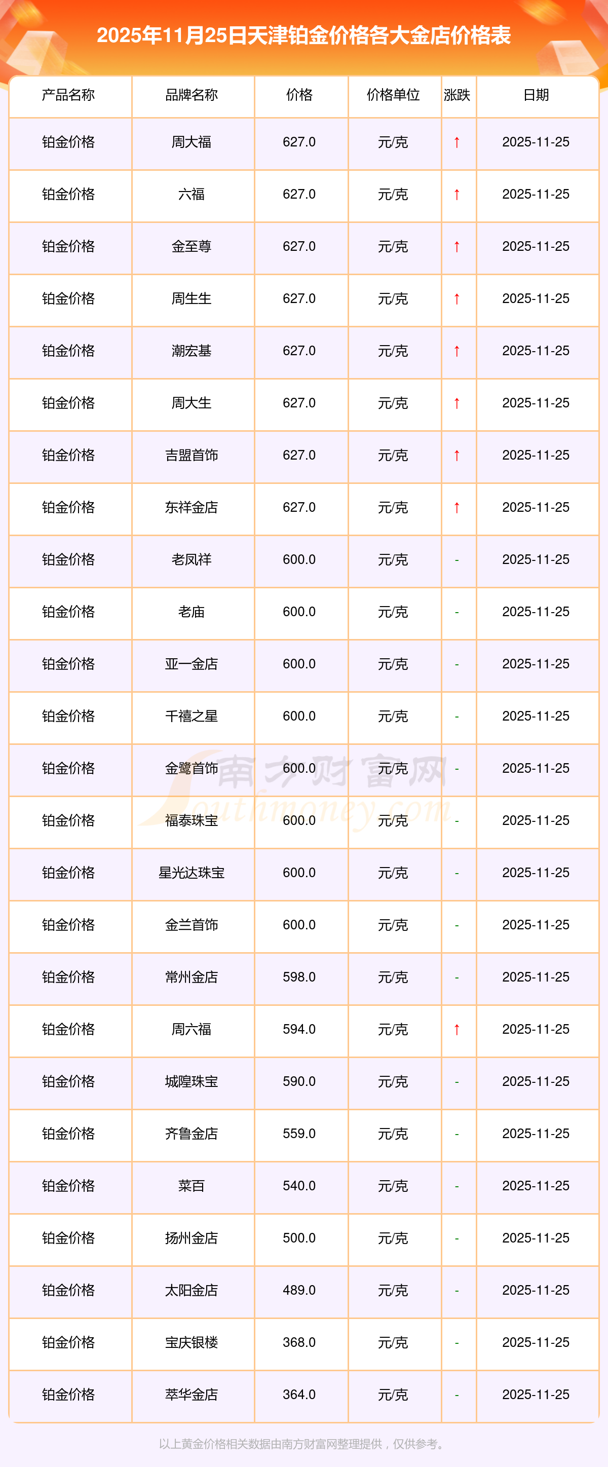 2025年11月25日天津周大福、周大福、周大福、周大福、周大福、周大福、周大福、老鳳祥、老鳳祥、老鳳祥、周六福等各大金店品牌鉑金價格最新價格如下:周大福黃金價格1312.0元/克,周大福鉑金價格627.0元/克,周大福飾品金價(內地)1312.0元/克,周大福黃金飾品(香港)45780.0,周大福鉑金價格(香港)17900.0,周大福金條價格(香港)41290.0,周大福金條金價(內地)1148.0元/克,老鳳祥黃金價格1315.0元/克,老鳳祥鉑金價格600.0元/克,老鳳祥足金價格1315.0元/克,周六福黃金價格1278.0元/克。