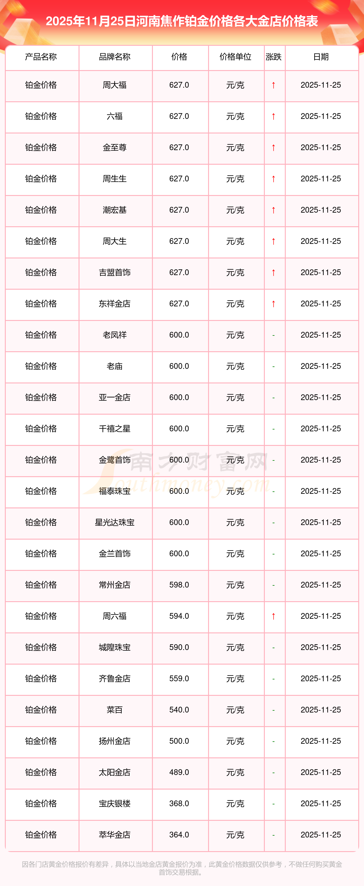 今天是2025年11月25日,河南焦作周大福、周大福、周大福、周大福、周大福、周大福、周大福、老鳳祥、老鳳祥、老鳳祥、周六福等各大金店品牌鉑金價格最新價格如下:周大福1312.0元/克、周大福627.0元/克、周大福1312.0元/克、周大福45780.0、周大福17900.0、周大福41290.0、周大福1148.0元/克、老鳳祥1315.0元/克、老鳳祥600.0元/克、老鳳祥1315.0元/克、周六福1278.0元/克。