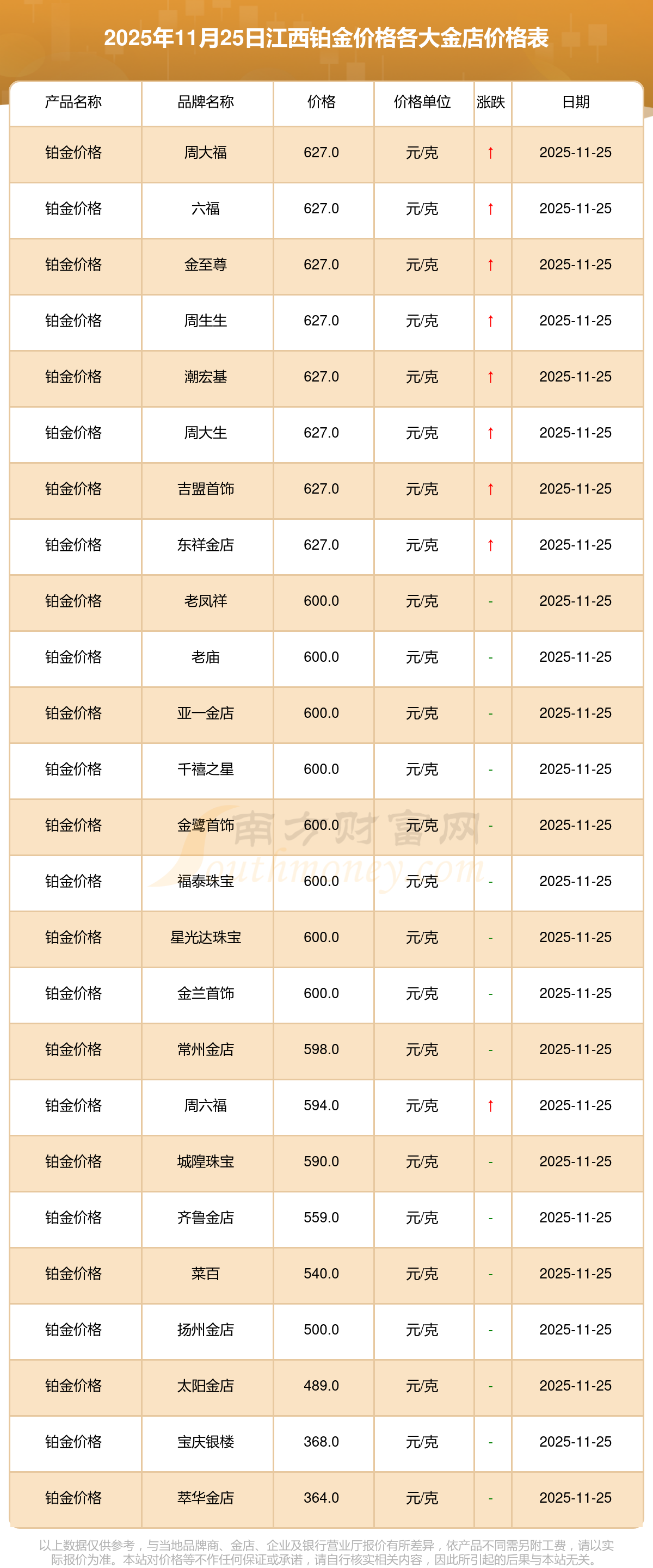2025年11月25日江西各金店鉑金價(jià)格是多少錢(qián)一克?各金店鉑金價(jià)格表公布