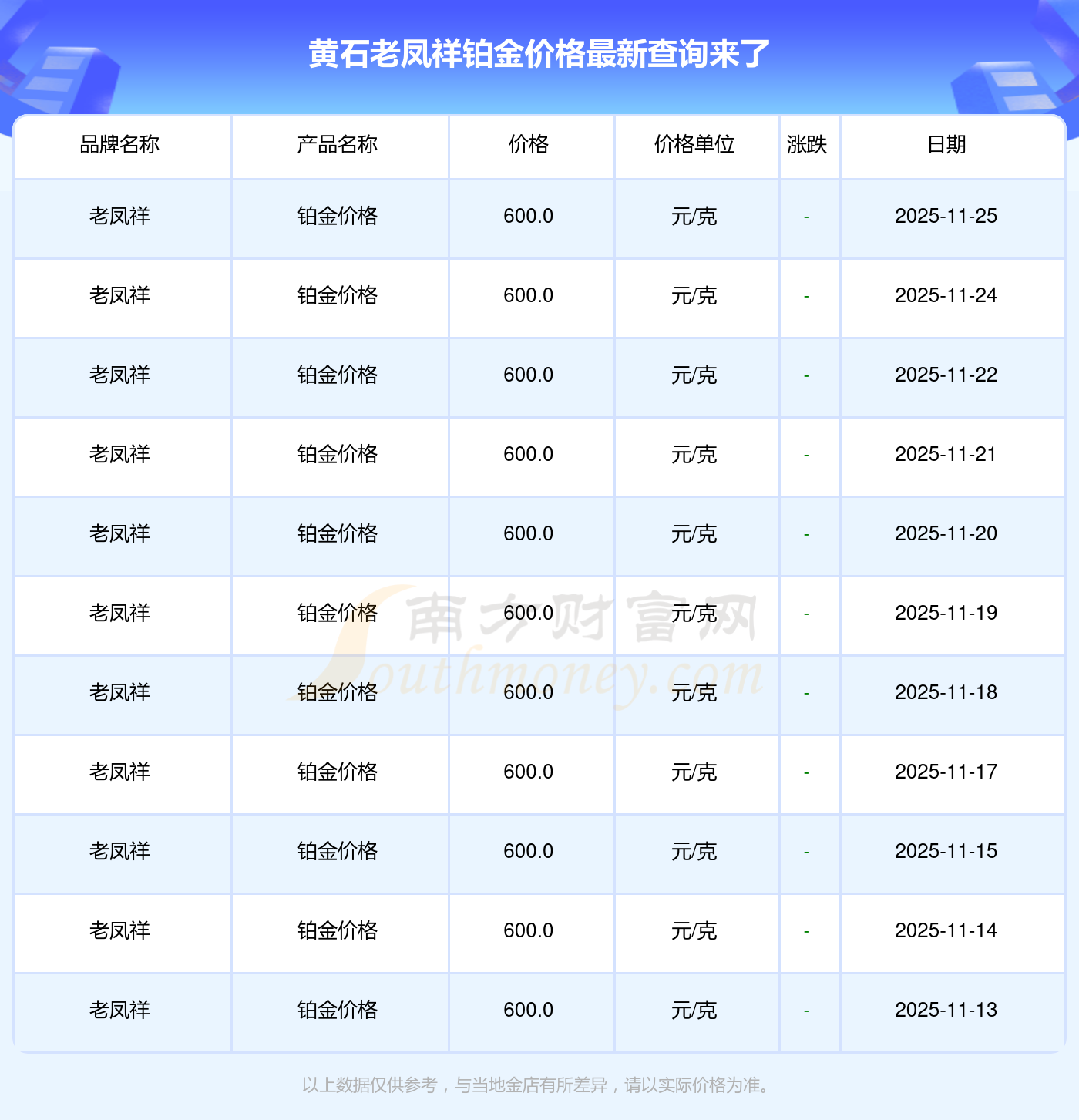 黃石老鳳祥的鉑金價格在今日(2025年11月25日),每克售價為600.0元/克。