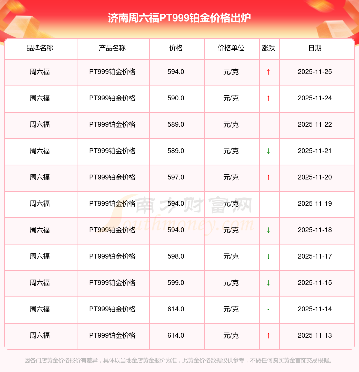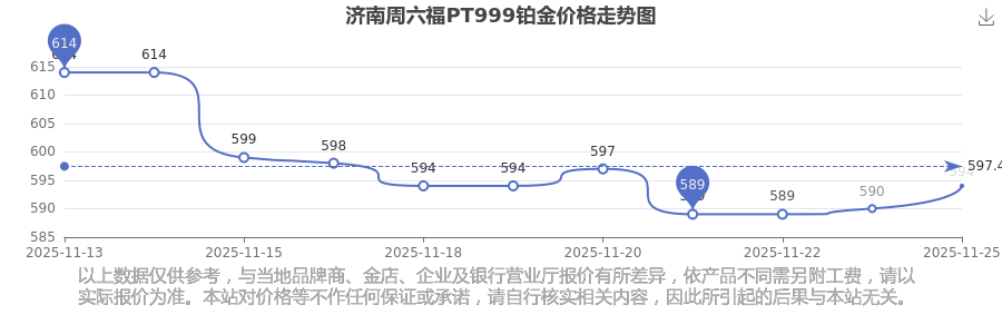 今日濟(jì)南周六福PT999鉑金價(jià)格為594.0元/克。