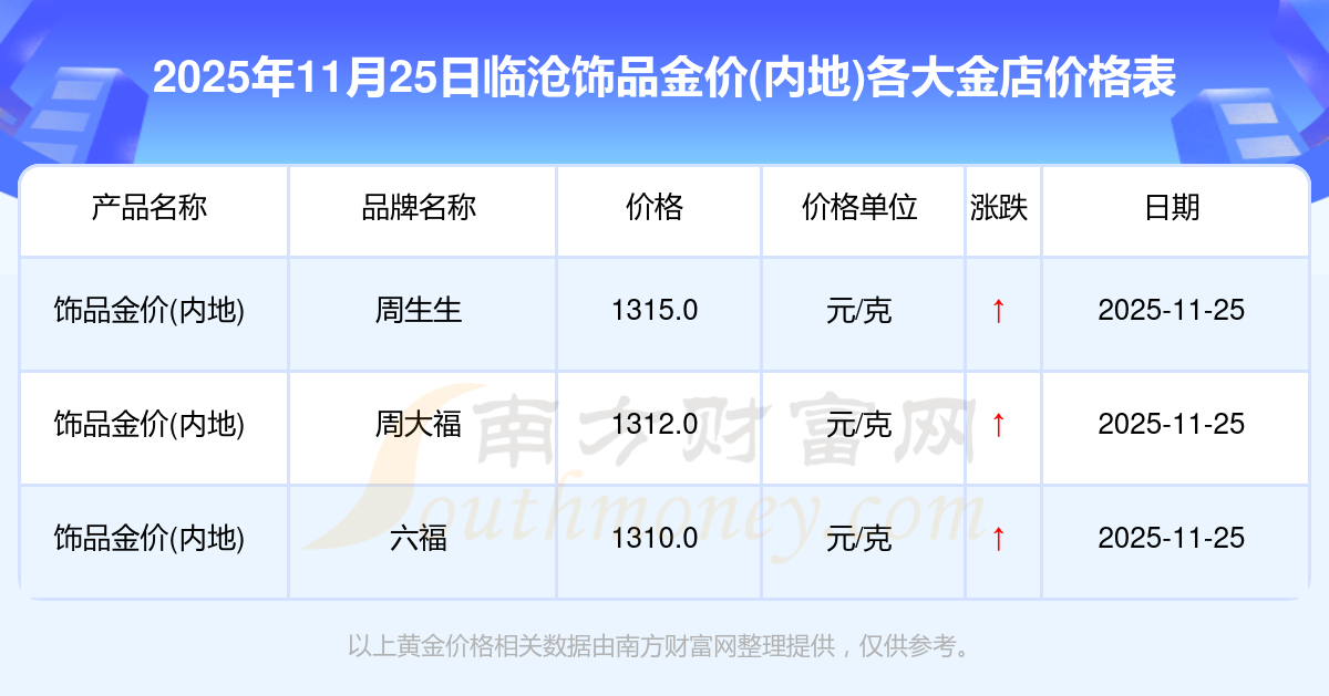 二、2025年11月25日今日臨滄各金店飾品金價(內地)實時查詢表